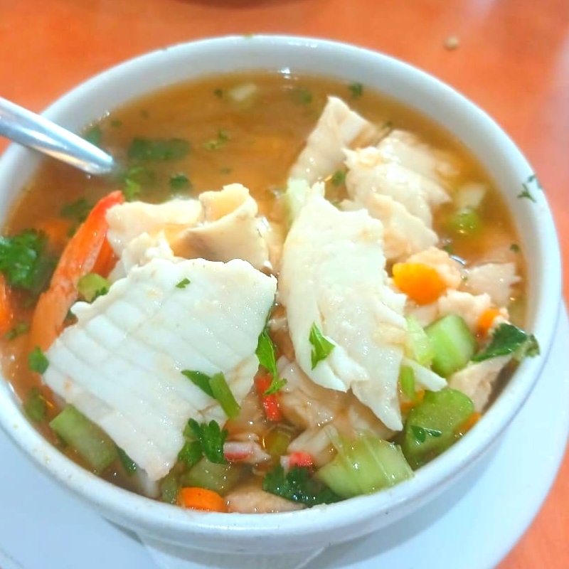 1/2 caldo mixto con camarón y pescado tilapia y porción de arroz
