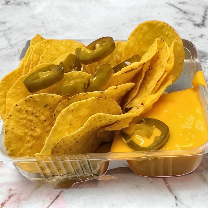 Delicioso elote desgranado preparado, acompañado de tostitos verdes y morados, bañados en rico queso amarillo, crema y salsa.