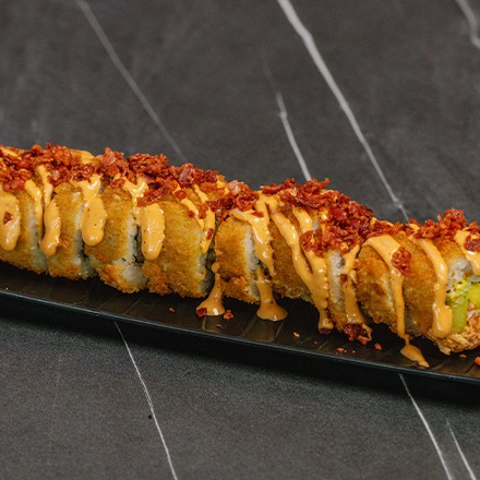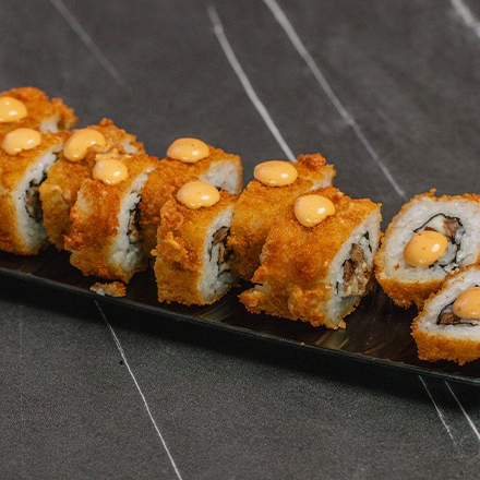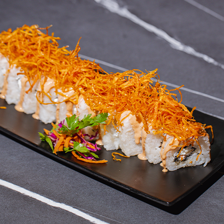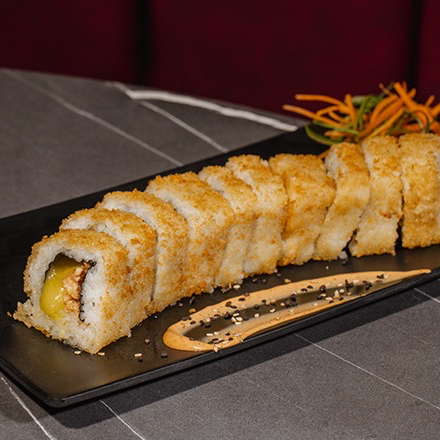 zanahoria rallado surimi queso crema forrado de camaron chipotle y zanahoria frita