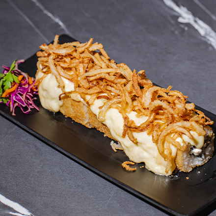 queso crema con nuestra salsa secreta carne de res empanizado queso gratinado y cebolla caramelizada