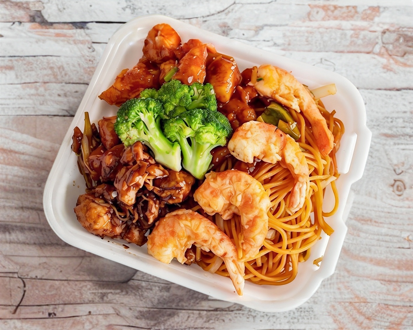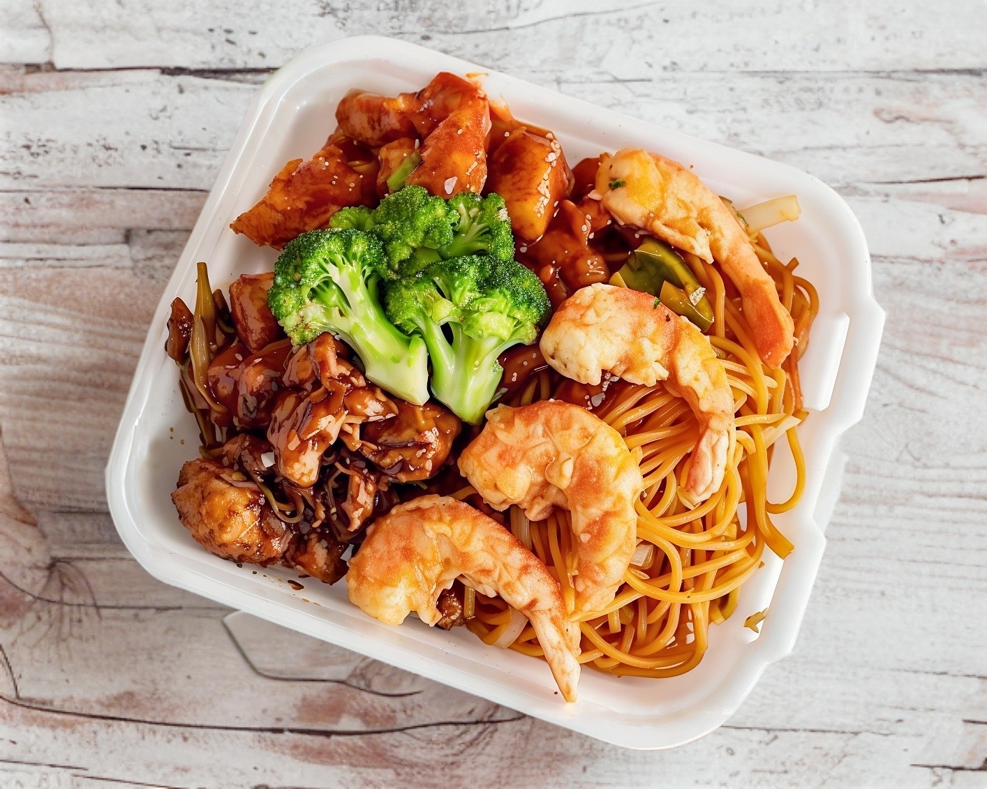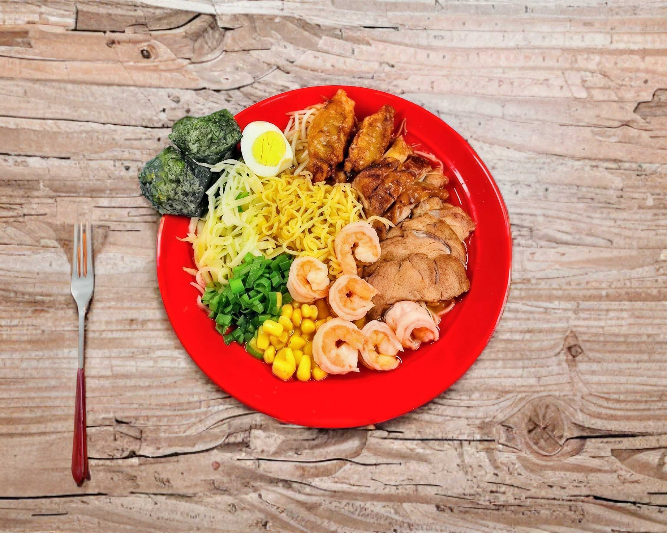 Ramen con Mixto pollo, res y camarón ( guarnición con pasta,soya,repollo,elote amarillo,huevo,cebollitas,mandu)
