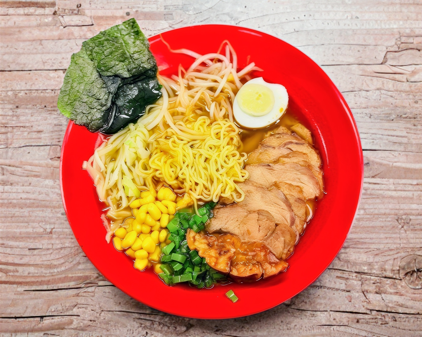 Ramen con pollo teriyaki ( guarnición con pasta,soya,repollo,elote amarillo,huevo,cebollitas,mandu)