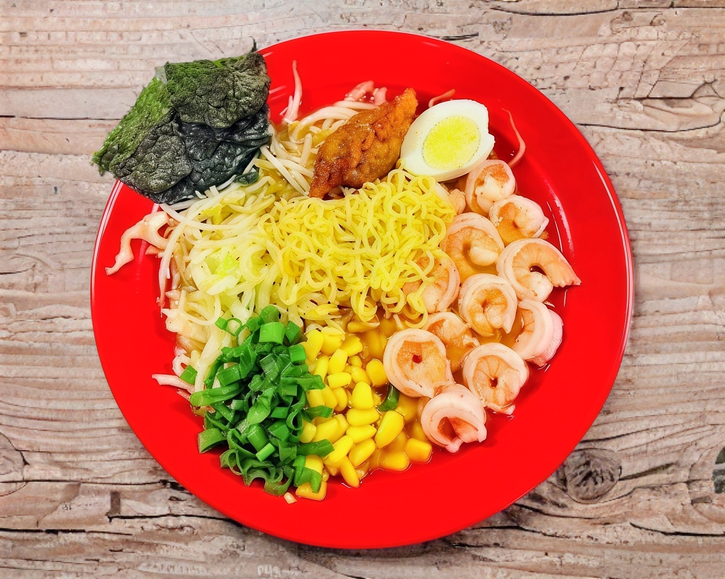 Ramen con Camarón( guarnición con pasta,soya,repollo,elote amarillo,huevo,cebollitas,mandu)