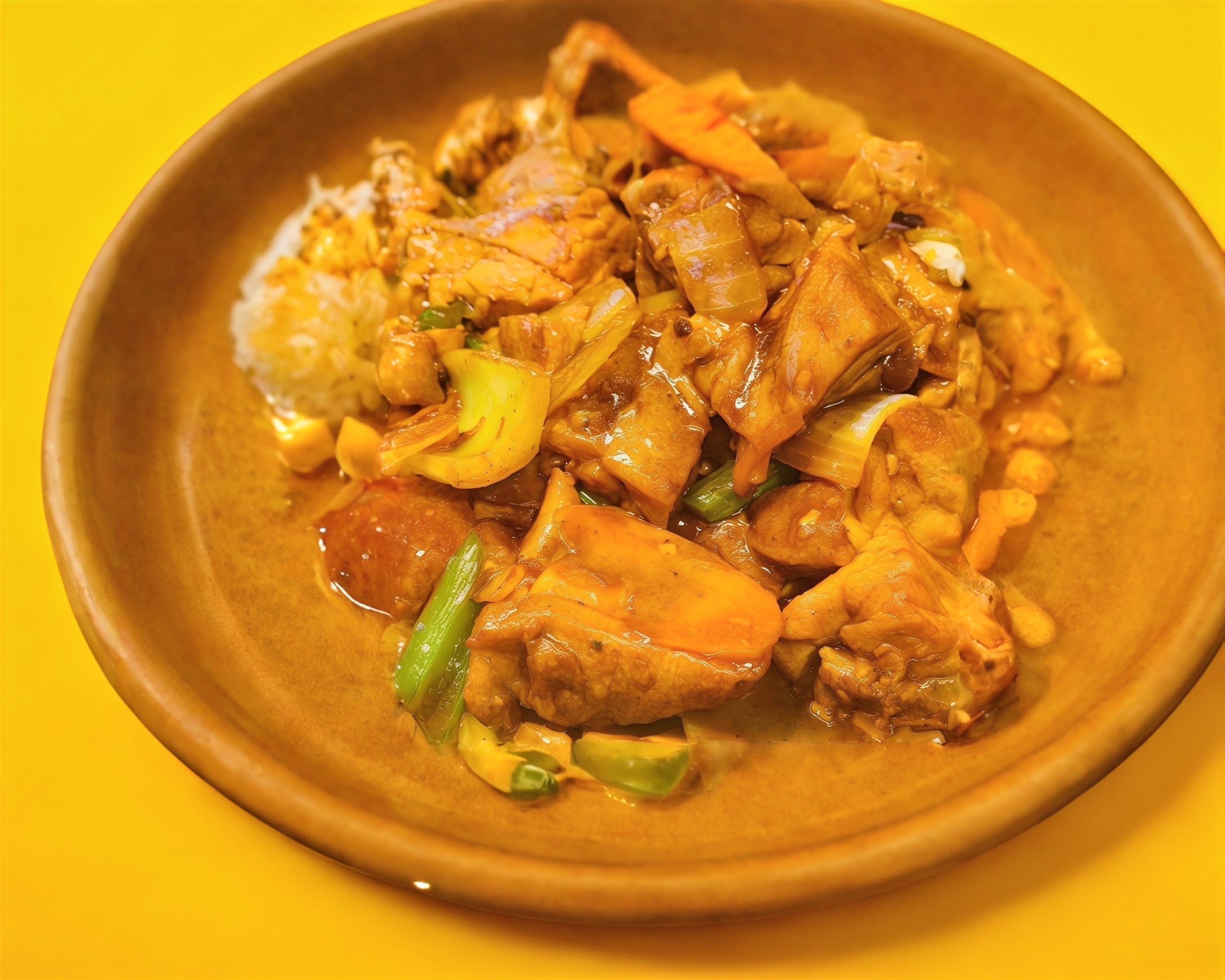 Dos guisos (pollo carne o calabaza lo escoges tu )y camaron 12 piezas + salsa dsoya salsa a escoger