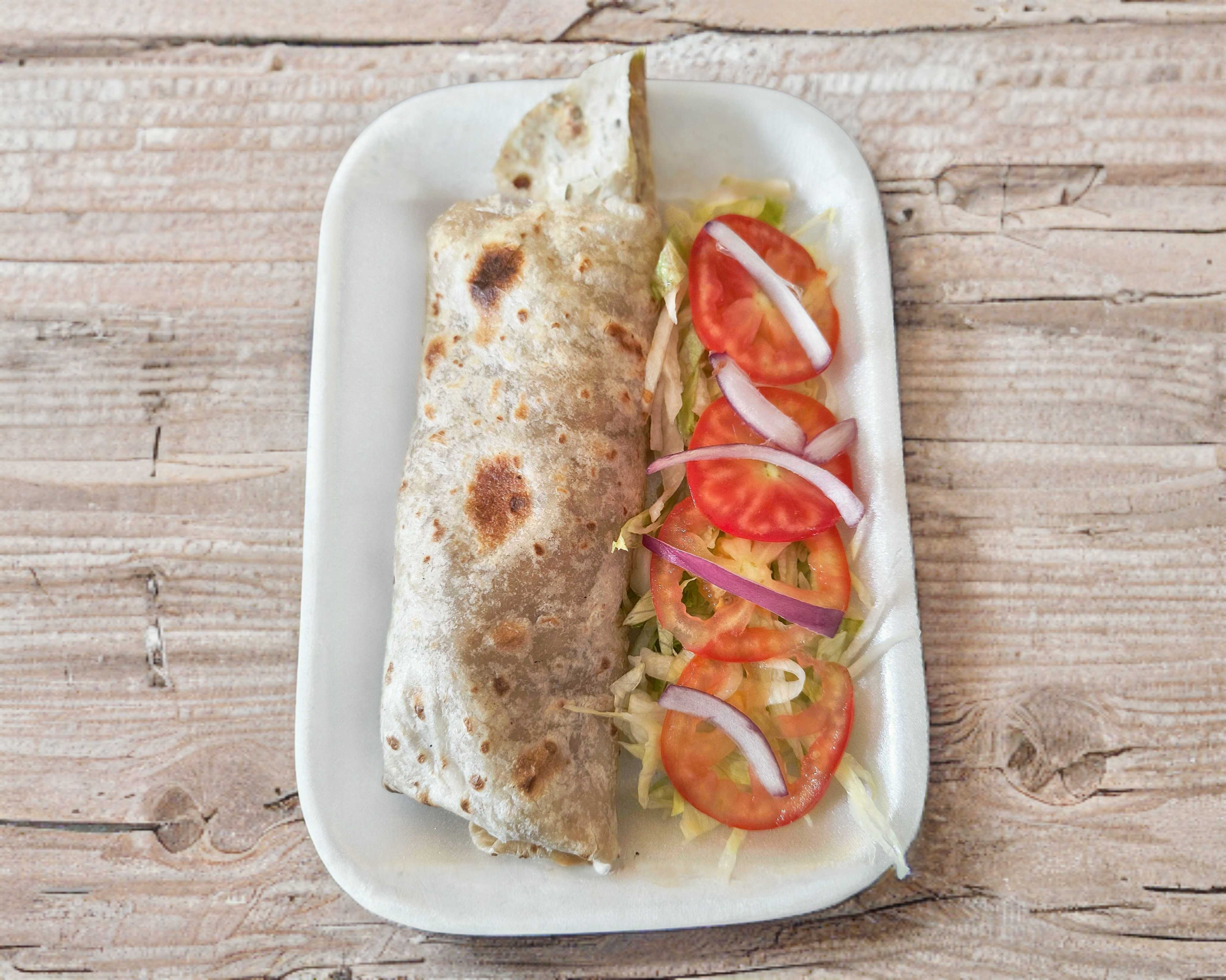 Burrito tortilla de harina con frijoles y asado verde acompañado con su romanita y rodajas de tomate