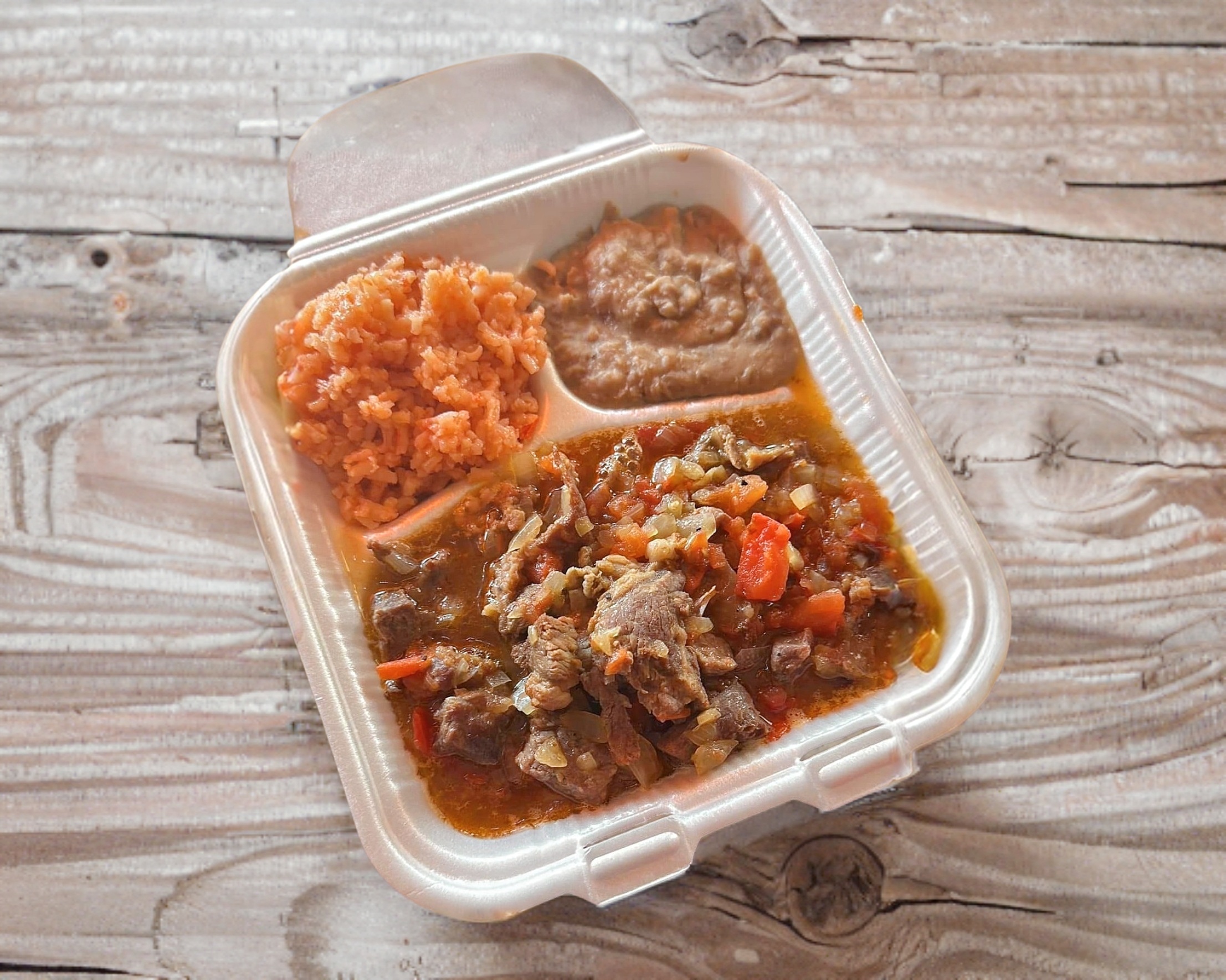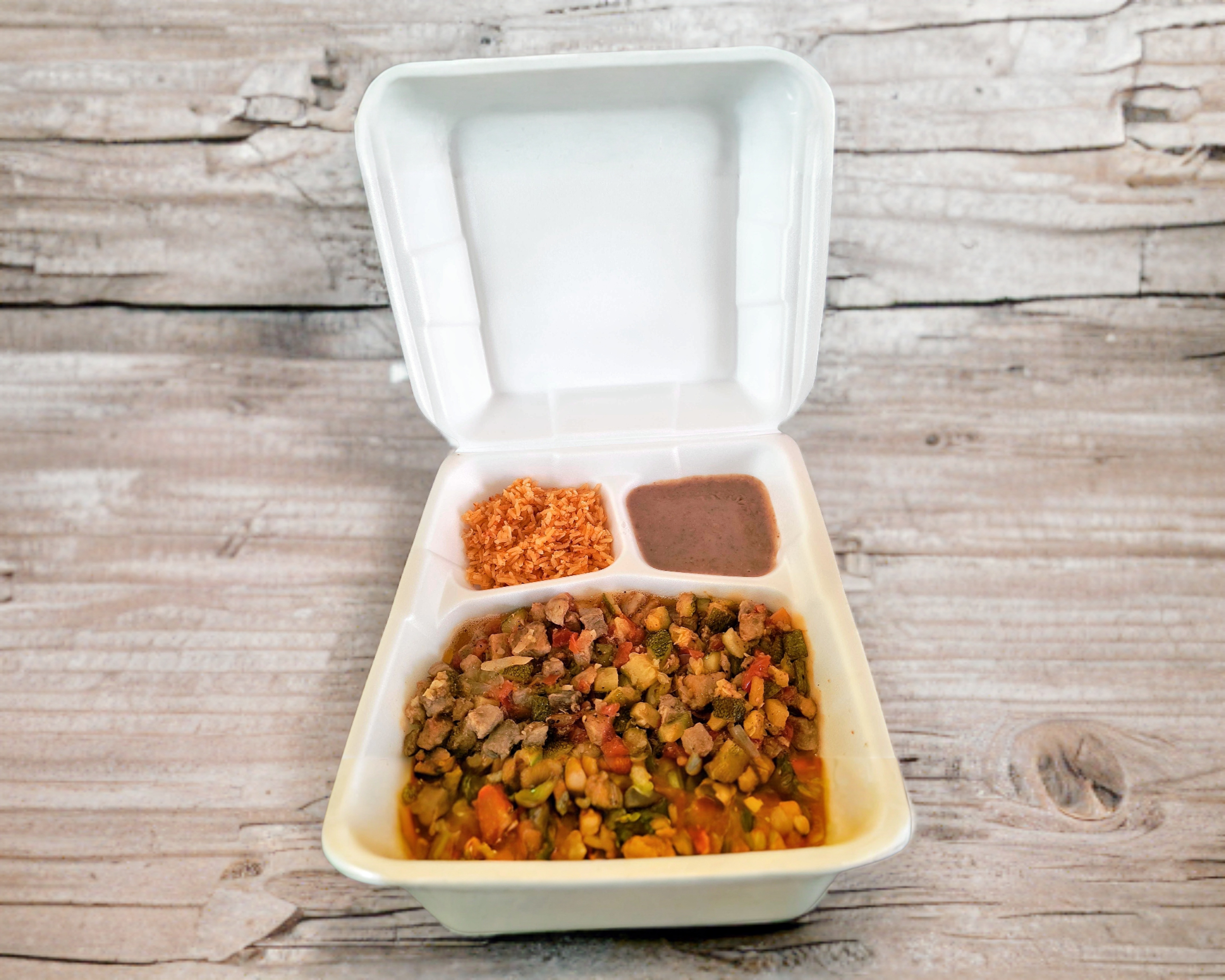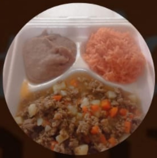 Carne de puerco ala mexicana con su arroz y frijoles y sus tortillas