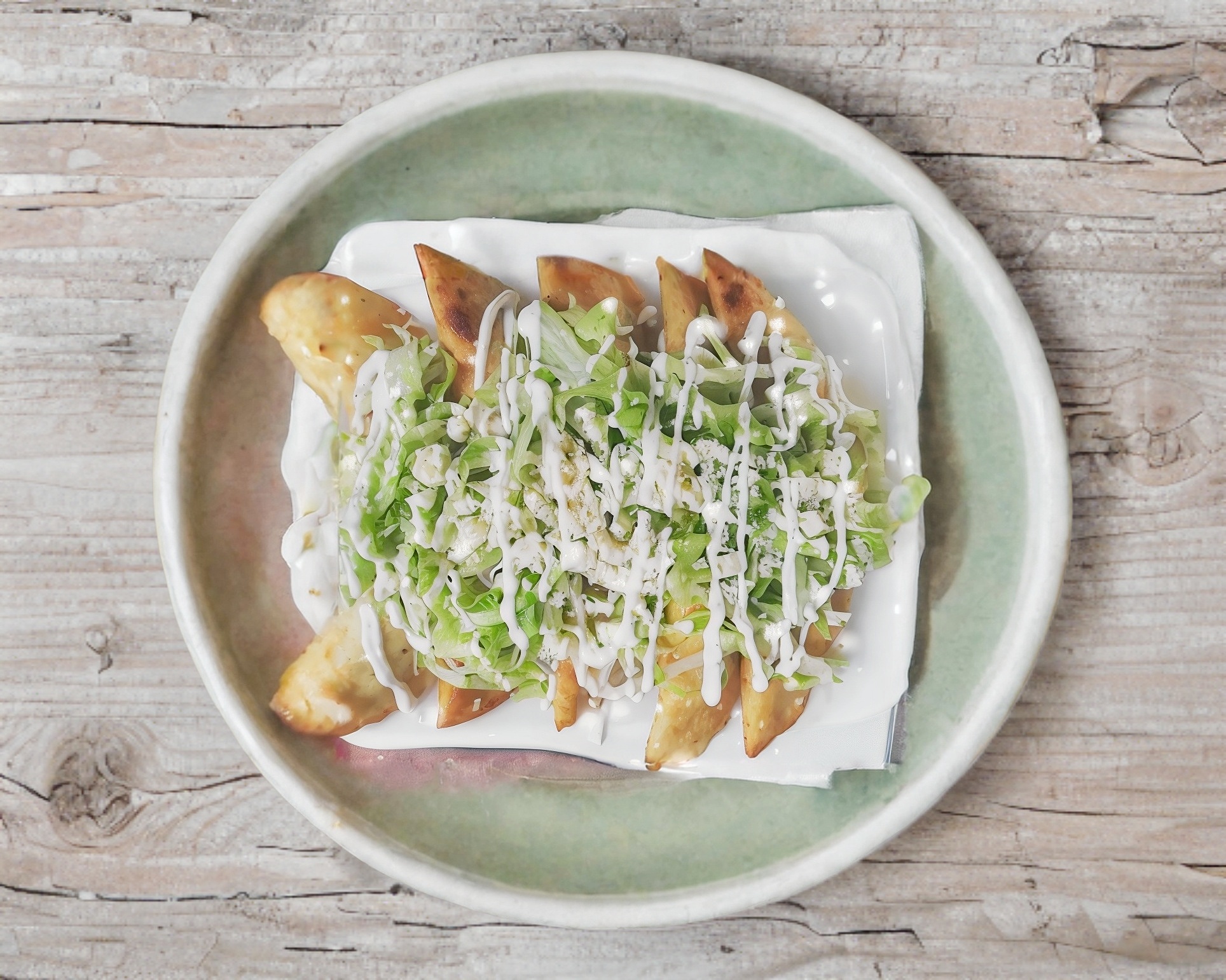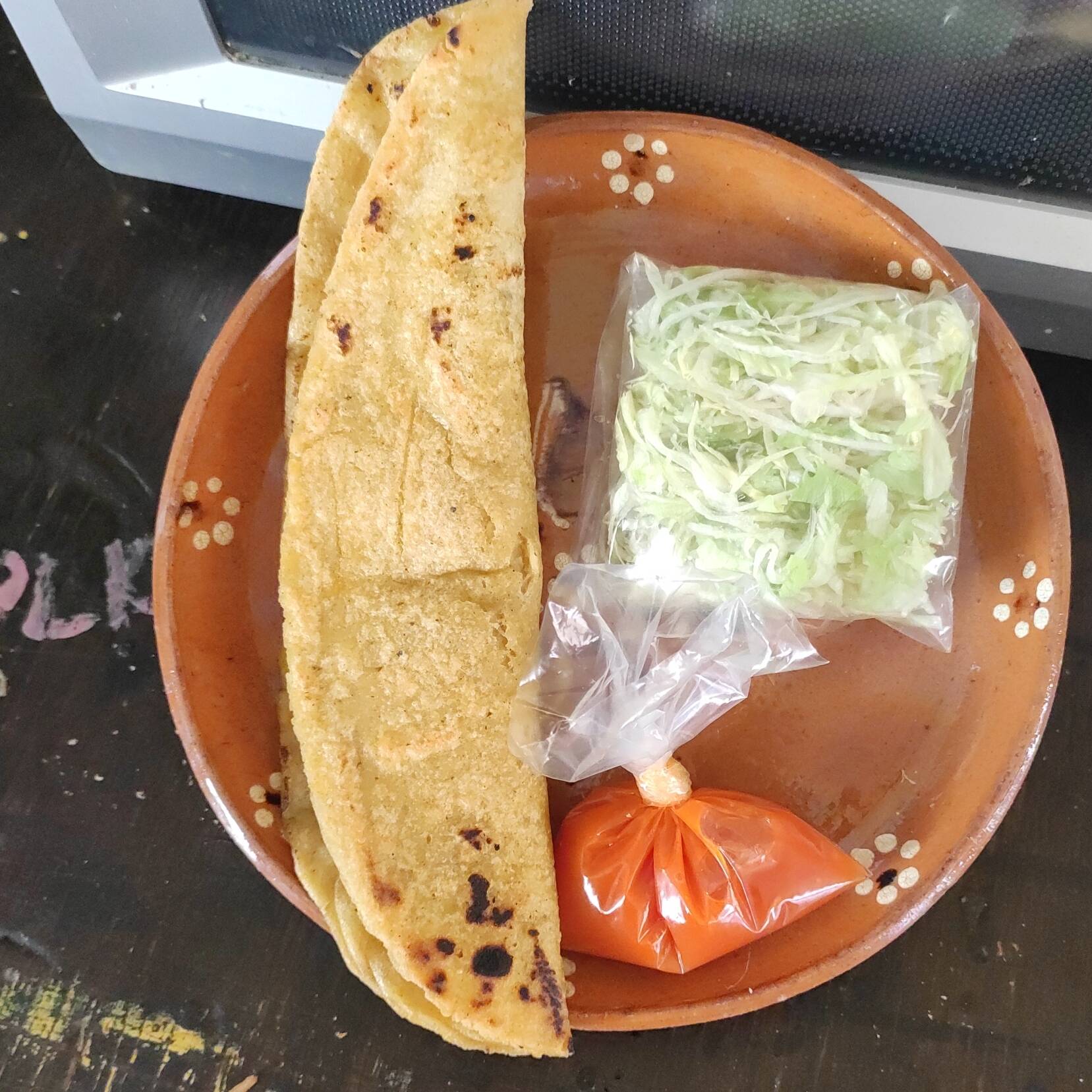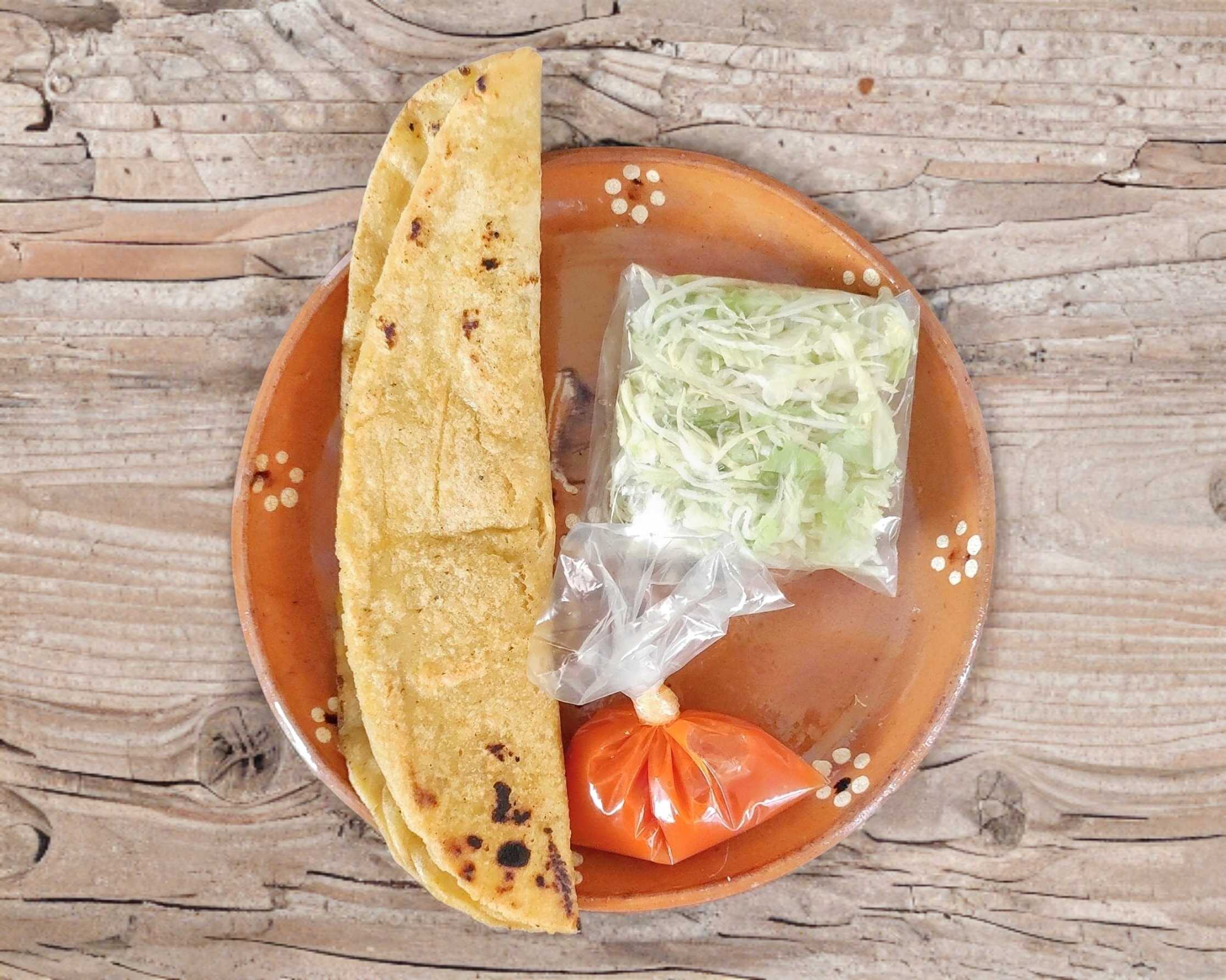 Tortilla obalada de 20a 22 cm con queso asadero y el guiso acompañado con su lechuga y salsa