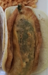 1 chile jalapeño relleno de pollo acompañado con arroz y tortilla