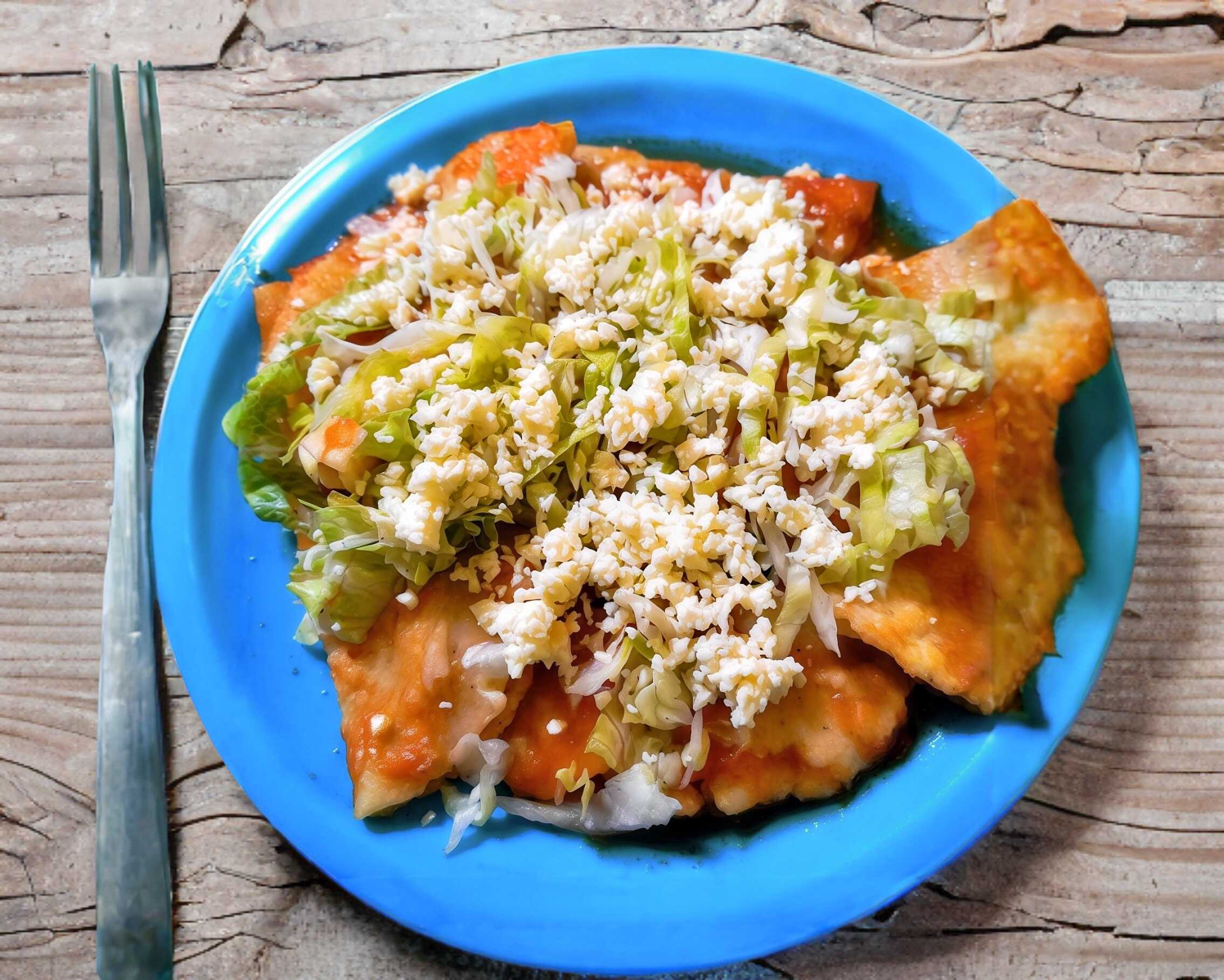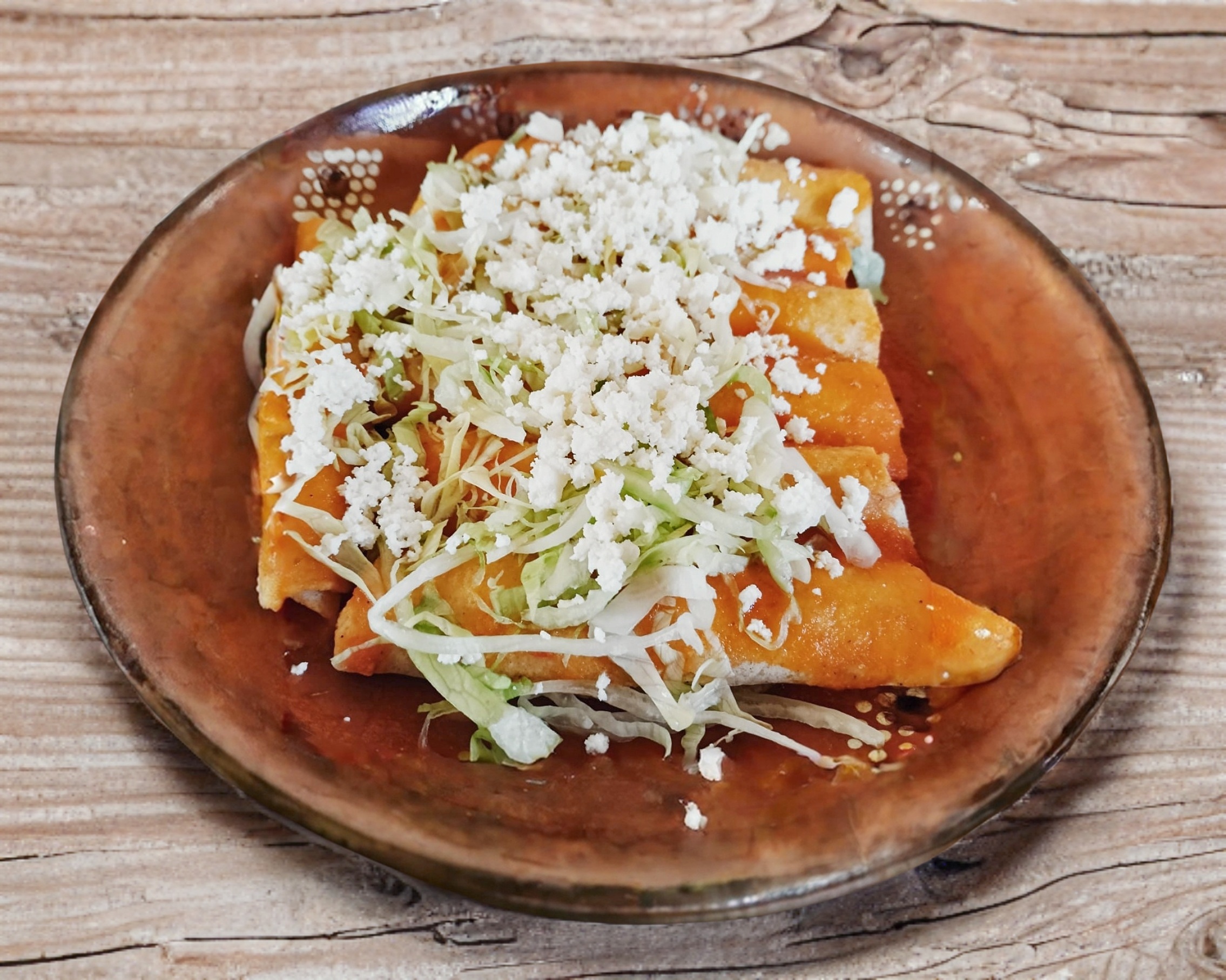 5 enchiladas en salsa roja acompañado con lechuga y queso y una tortita de huevo