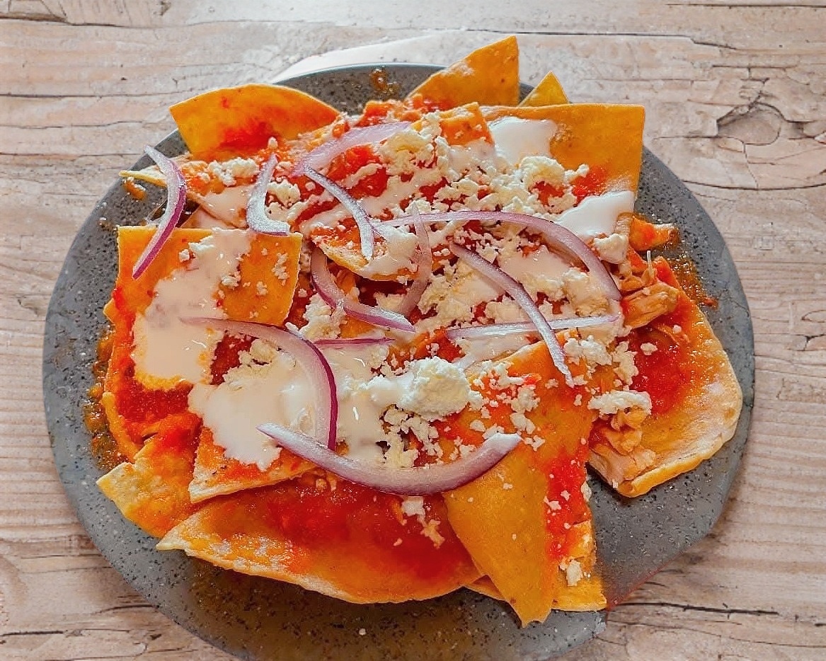 Chilaquiles rojos acompañado con crema cebolla pollo y queso