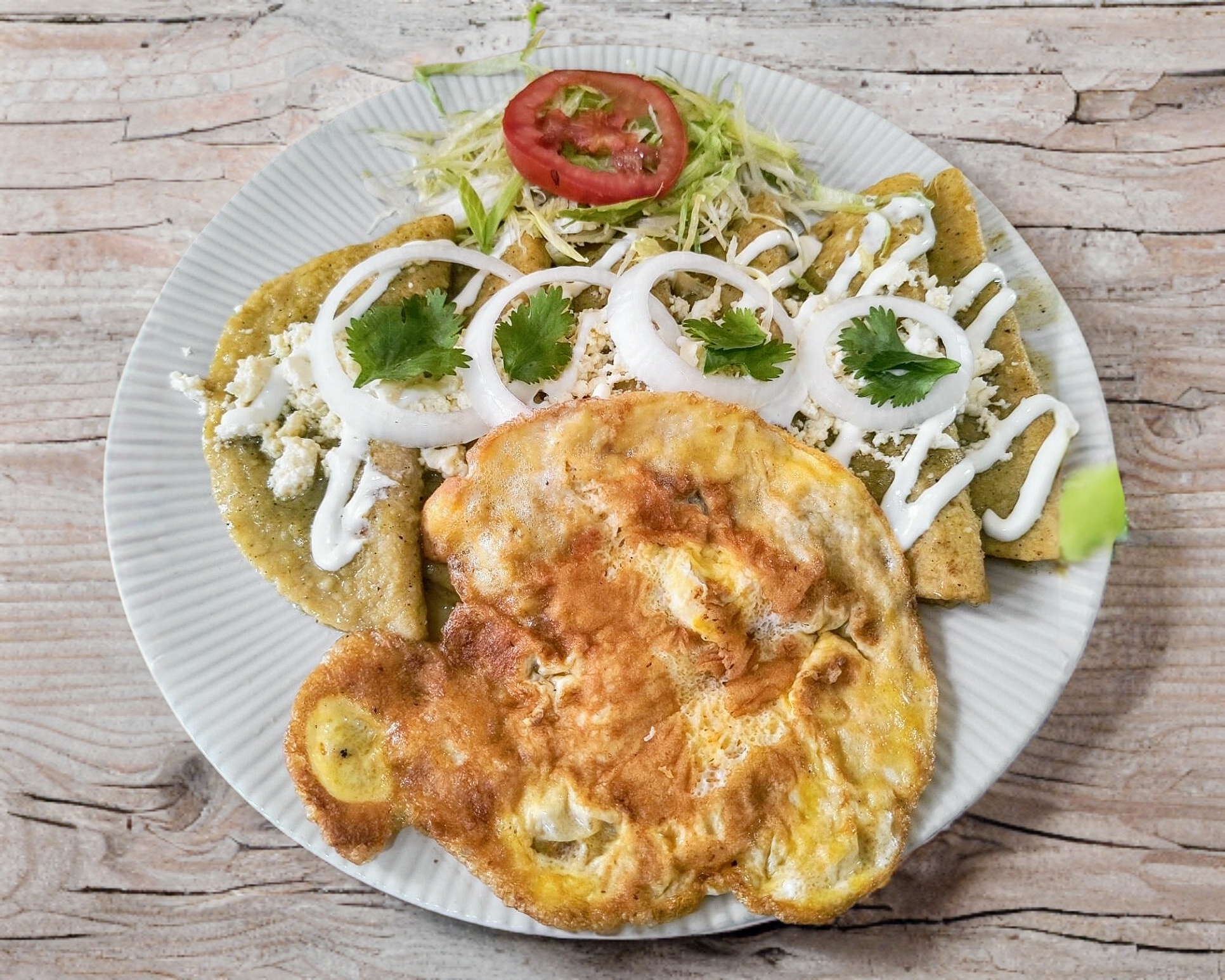 5enchiladas verdes acompañado con su lechuga y queso y una tortita de huevo