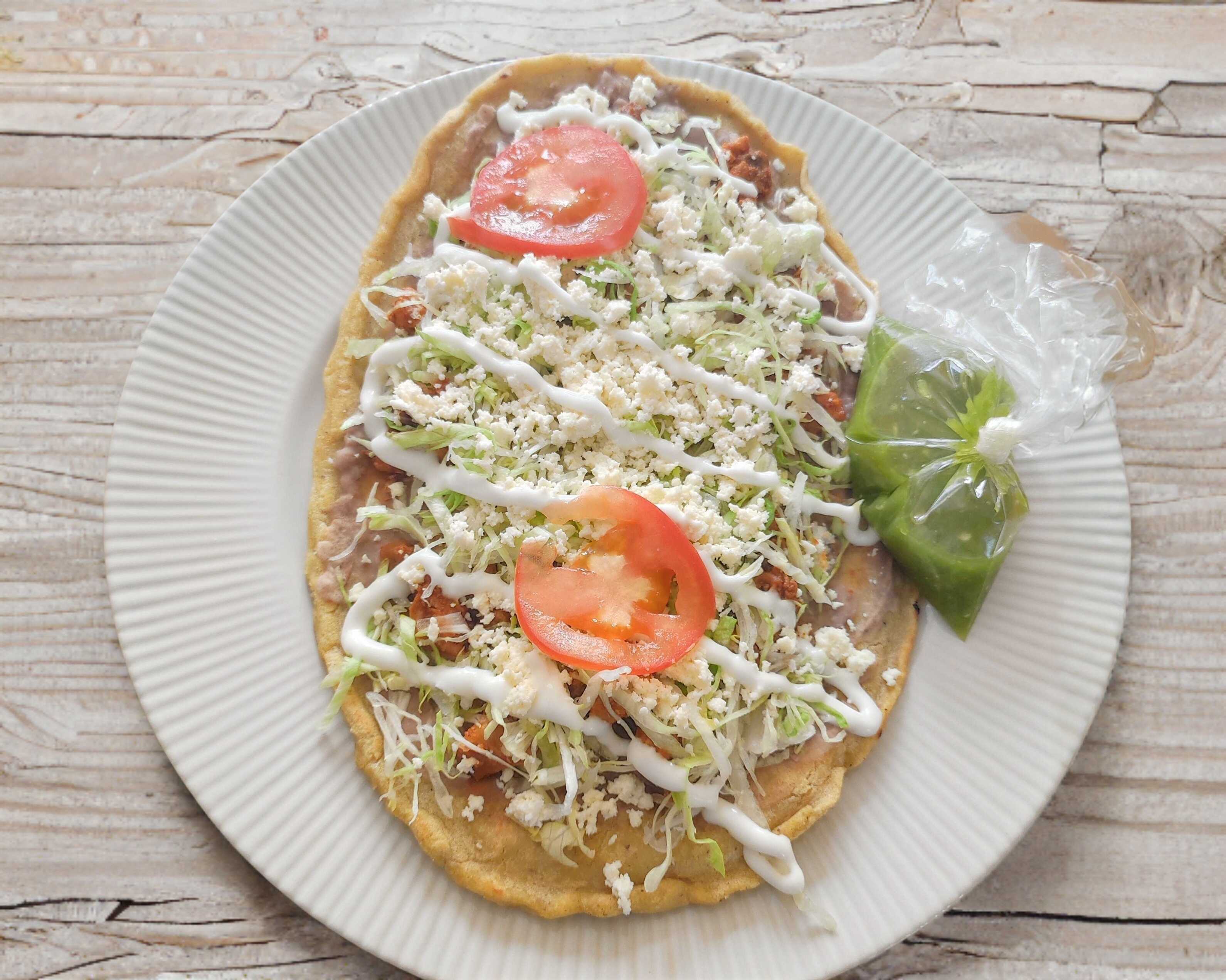 Tortilla obalada con frijoles refritos y el guiso acompañado con su romanita crema y tómate y su salsa