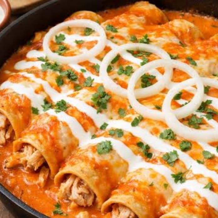 Enchiladas Suizas en Salsa Roja con (5) con queso gratinado acompañado con su ensalada y arroz