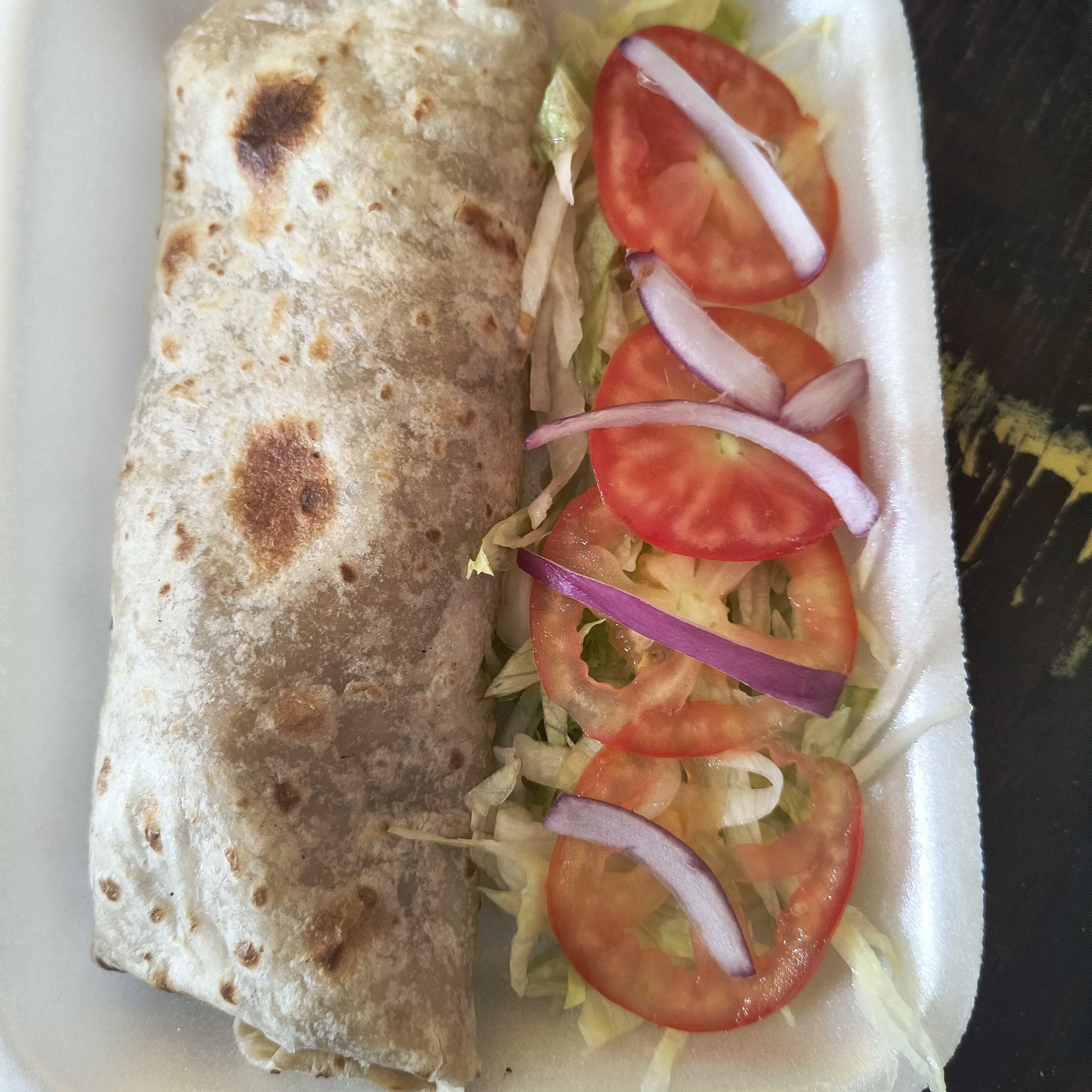 Burrito grande tortilla de harina acompaño con frijoles y Picadillo acompañado con romanita y rodajas de tomate,cebolla