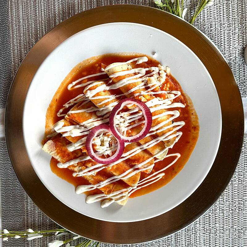 5 Piezas de envueltos rellenos de pollo, bañadas en salsa verde, gratinadas con queso manchego y crema. (Sin guamición).