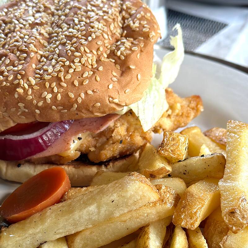Elaborada con carne de res casera, camarones, queso asadero, pimientos, cebolla, lechuga, tomate, aderezo chipotle y papas a la francesa.