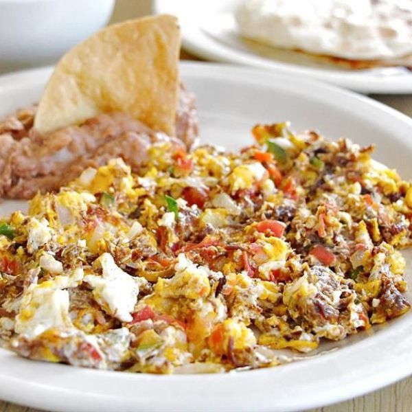 3 Piezas de huevo, natural con carne seca, a la mexicana o en salsa con frijoles y tortillas o pan rebanado.