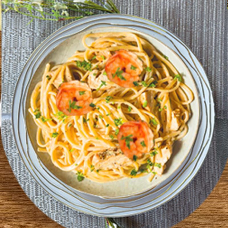 Hecha con pasta fetuccini, camarones y res, cebolla y mantequilla o crema.