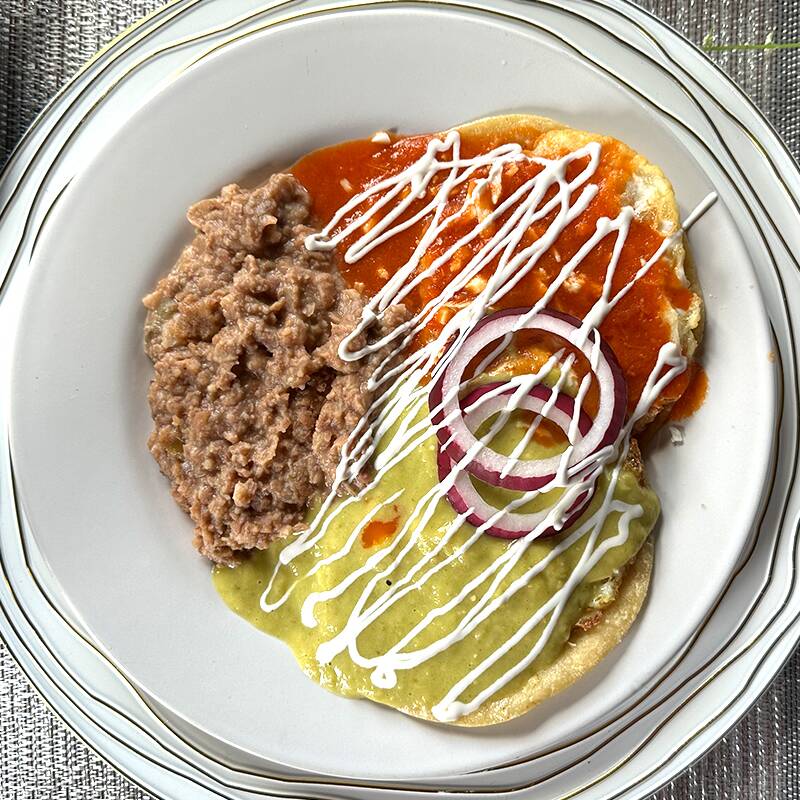 Elaborados con 150grms de trocitos de tortilla frita, 90 grms de pollo, 4 oz desalsa verde o roja, queso,15 grms de chorizo, 1 huevo y 80 gmsfrijoles.
