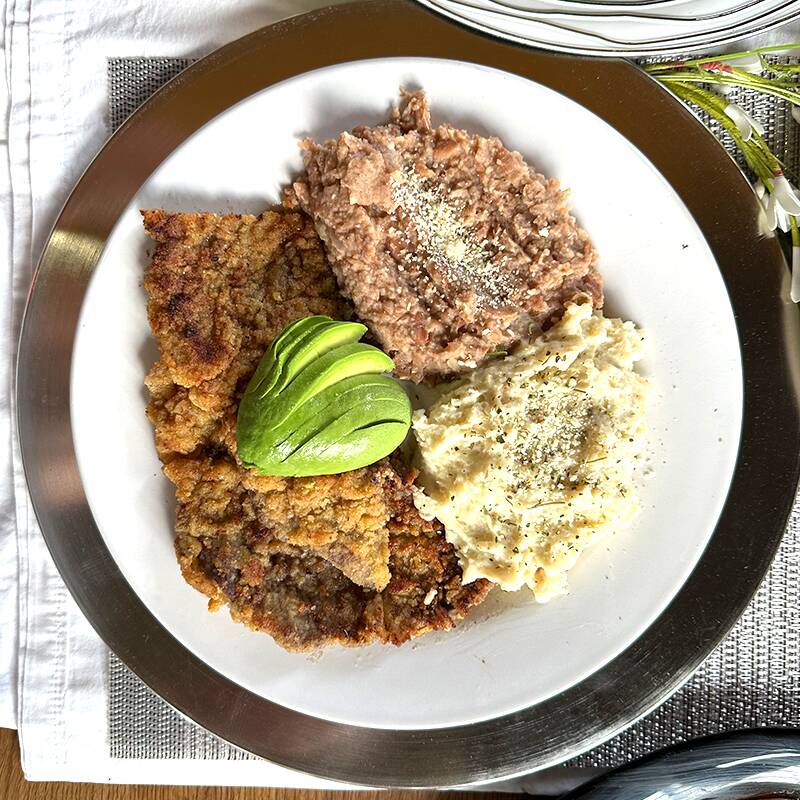 Milanesa de pulpa negra empanizada, Incluye 2 guarniciones, tortillas y salsa