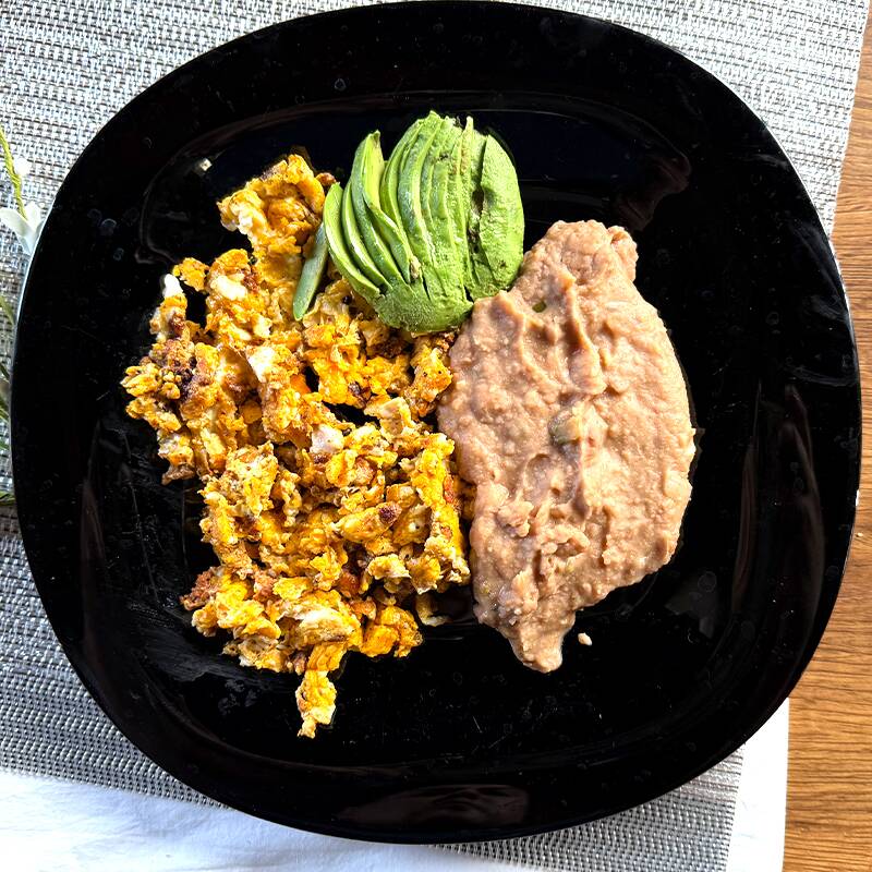 3 Piezas de huevos revueltos con chorizo, acompañados de frijoles y tortillas o pan rebanado.