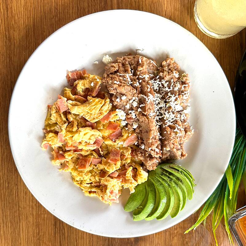 3 Piezas de huevos revueltos con jamón, acompañados de frijoles y tortillas o pan rebanado.