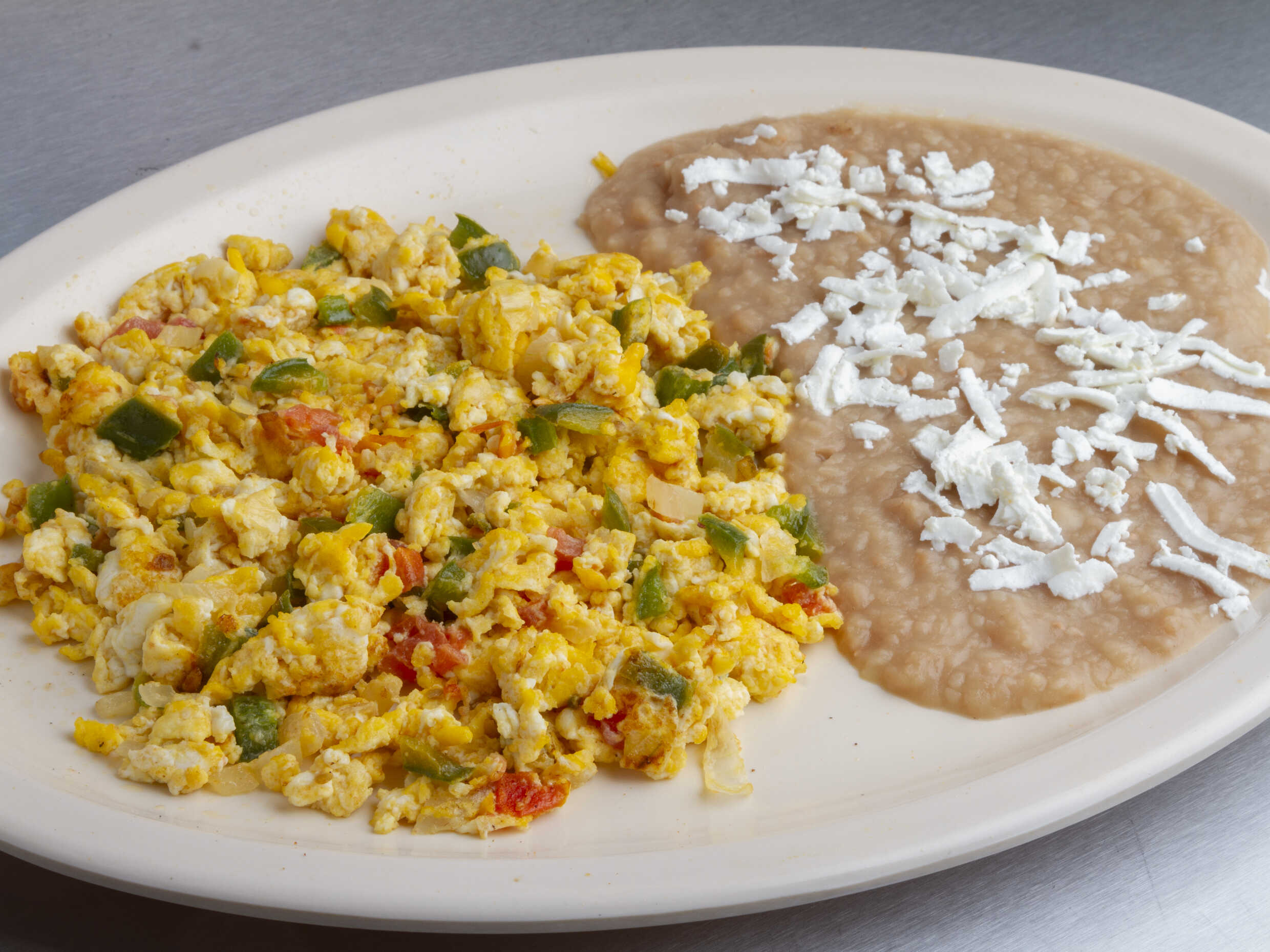 Acompañados de frijoles refritos con quesito, tortillas y salsa. (3 pzas de huevo por platillo)