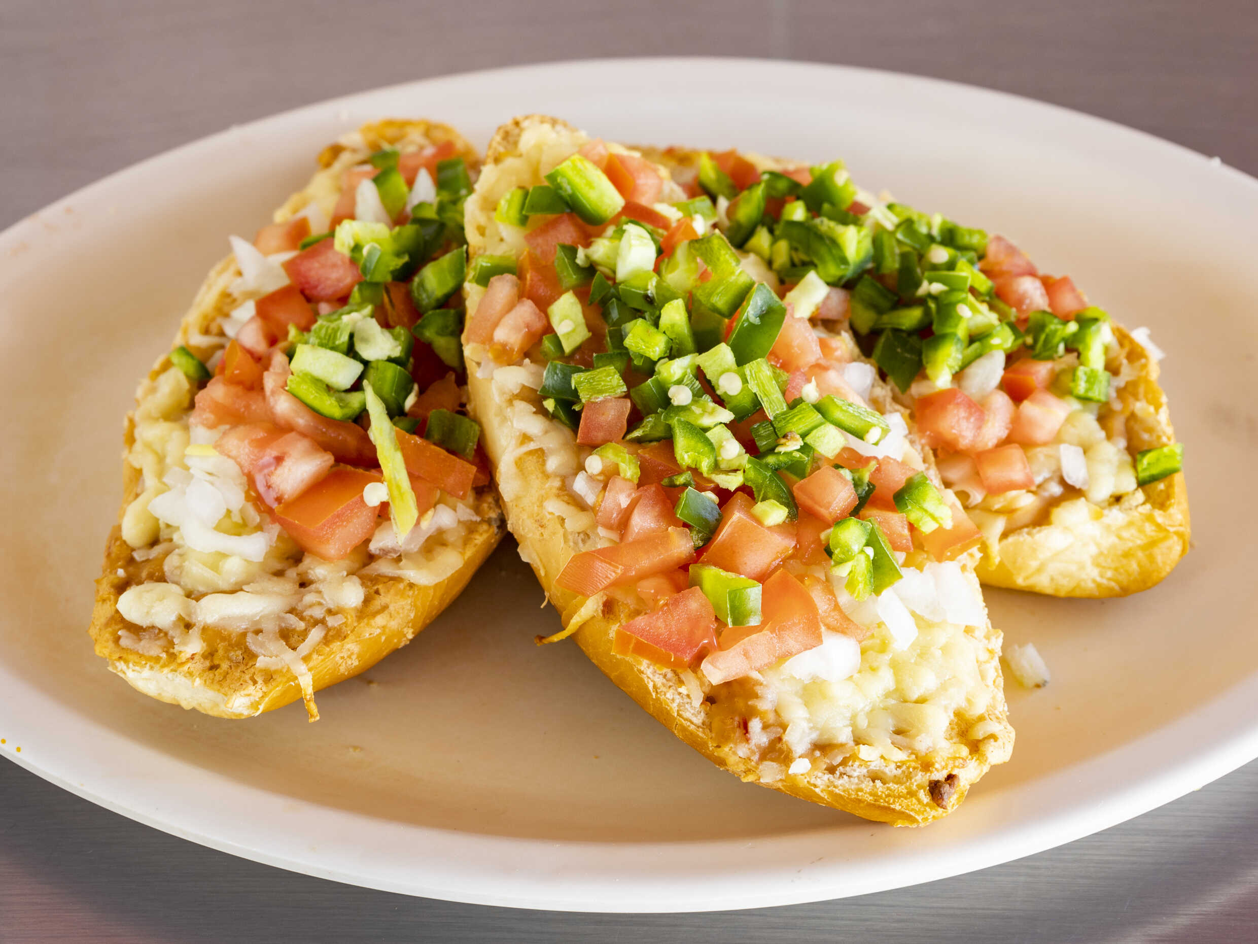 Crujiente pan frances con frijoles refritos, cama de queso asadero, con topping a elegir. (1 pza pan frances)