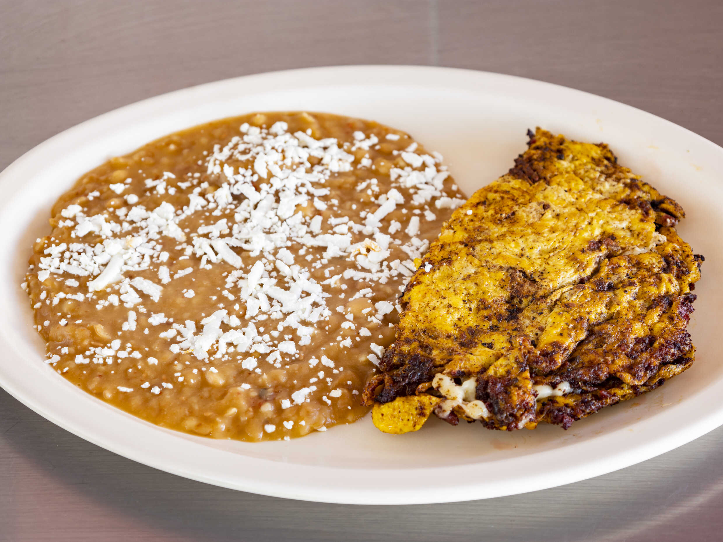 Acompañados de frijoles refritos con quesito, tortillas y salsa. (3 pzas)