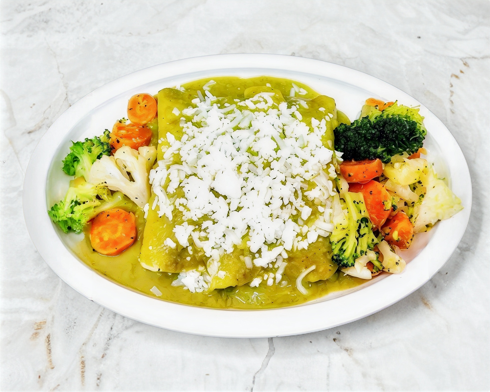 Enchiladas Suizas Personales (4 pz) – Deliciosas enchiladas rellenas de pollo, cubiertas con queso rallado y bañadas en salsa casera. Acompañadas de 2 guarniciones a elección.