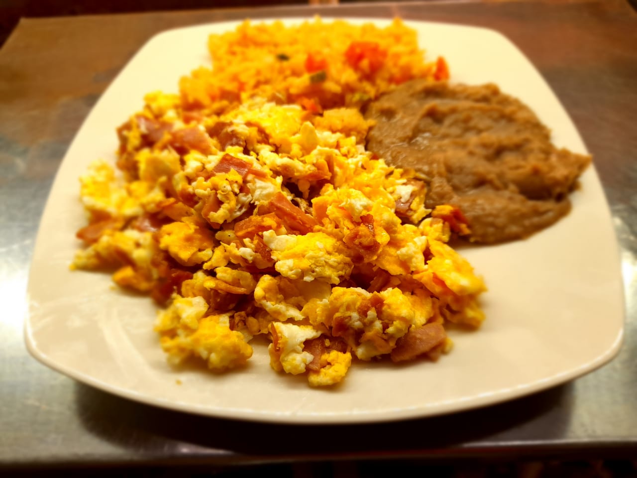 Huevos con jamón de pavo dorado acompañados con arroz, frijol, tortillas y salsita casera.