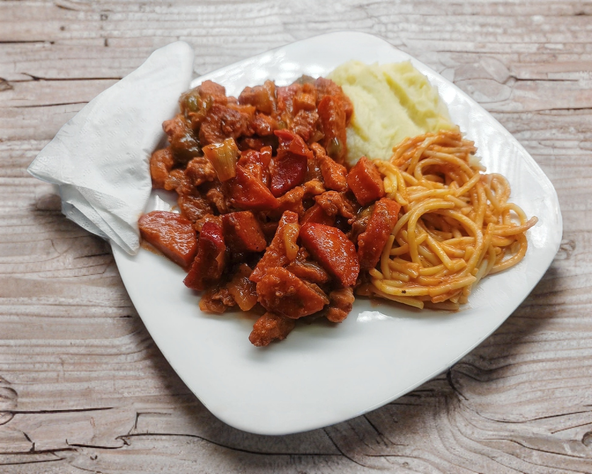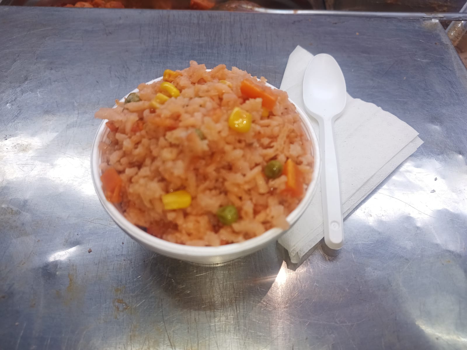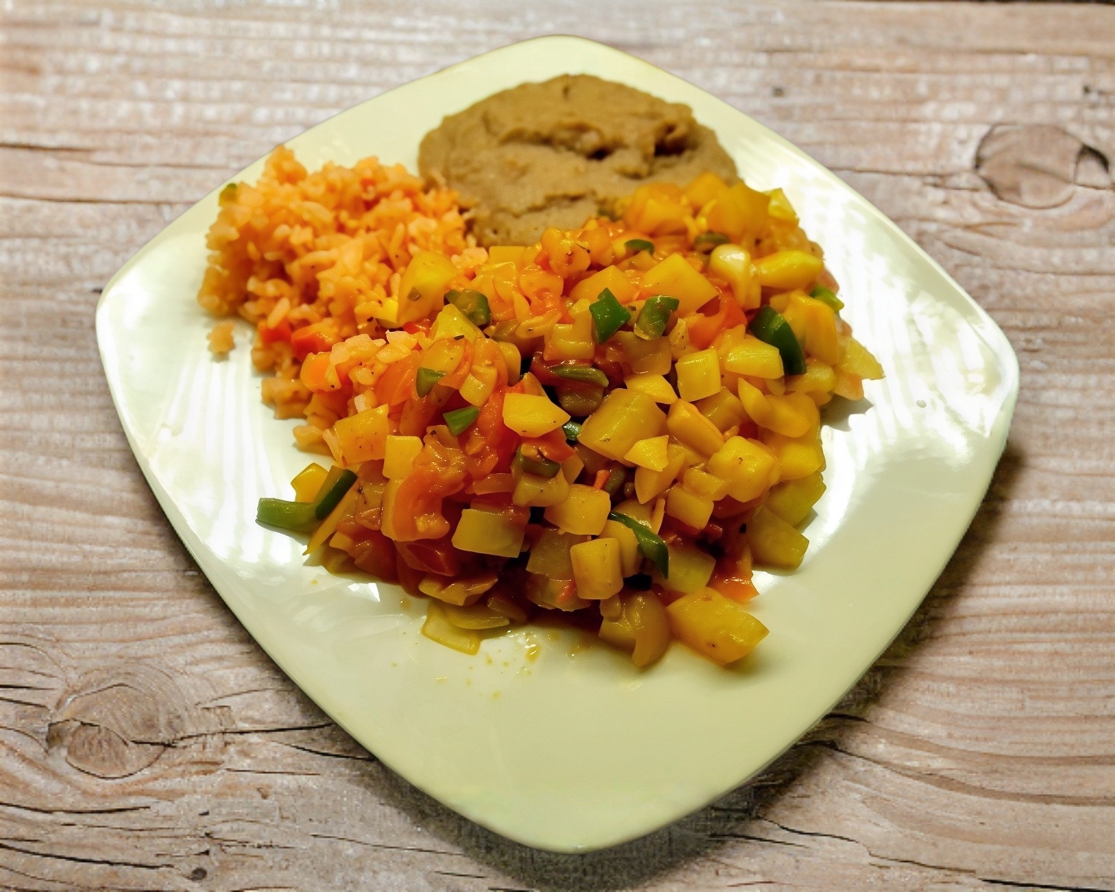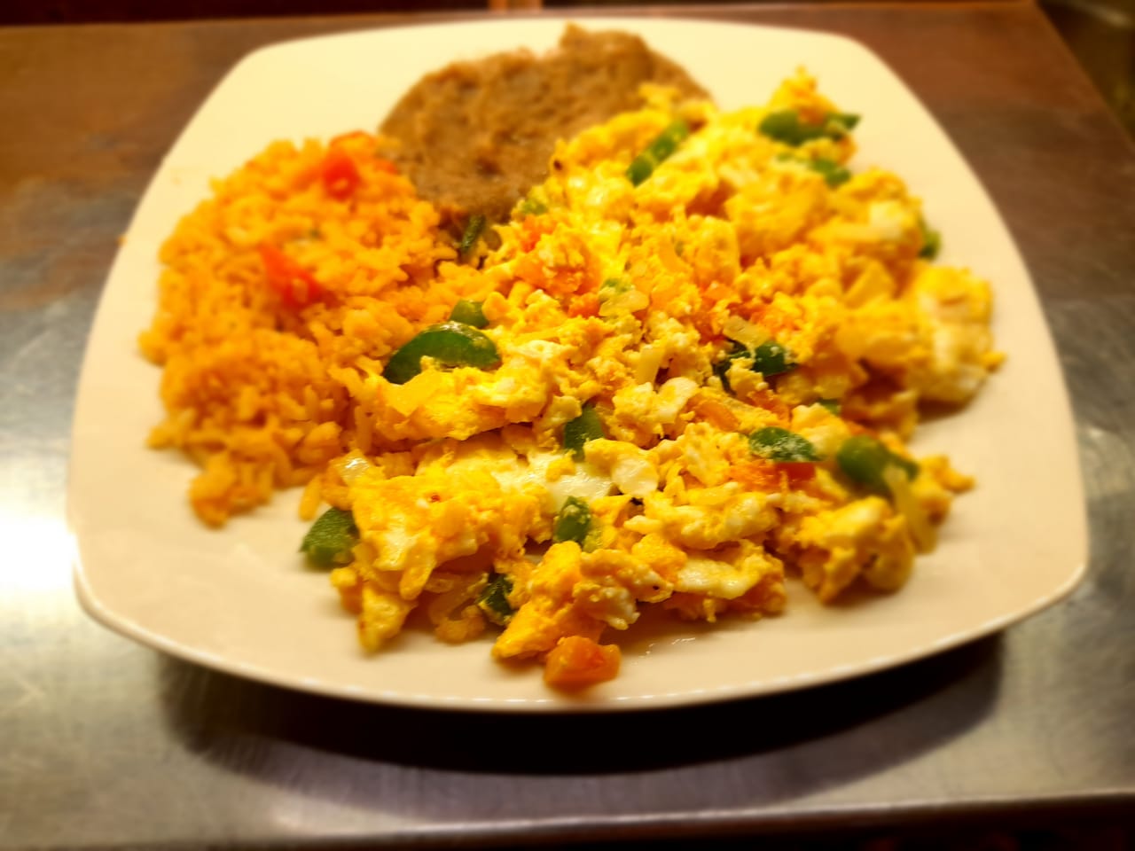 Huevos con chile, tomate y cebolla acompañados con arroz, frijol, tortillas y salsita casera.