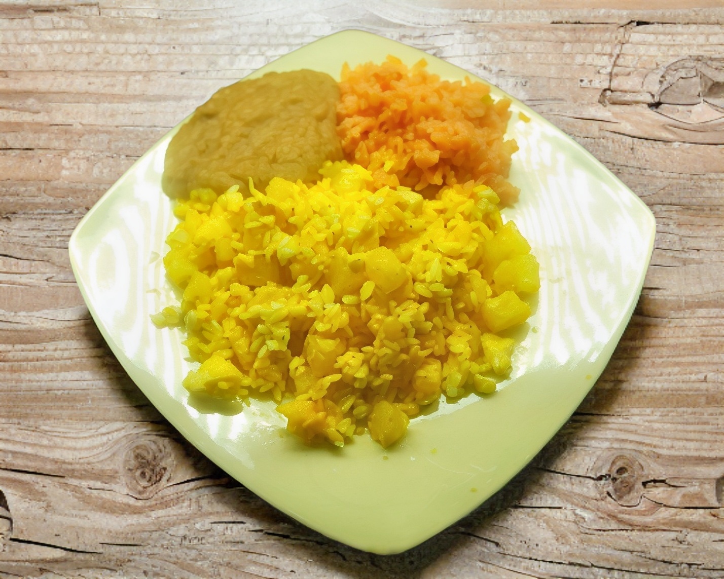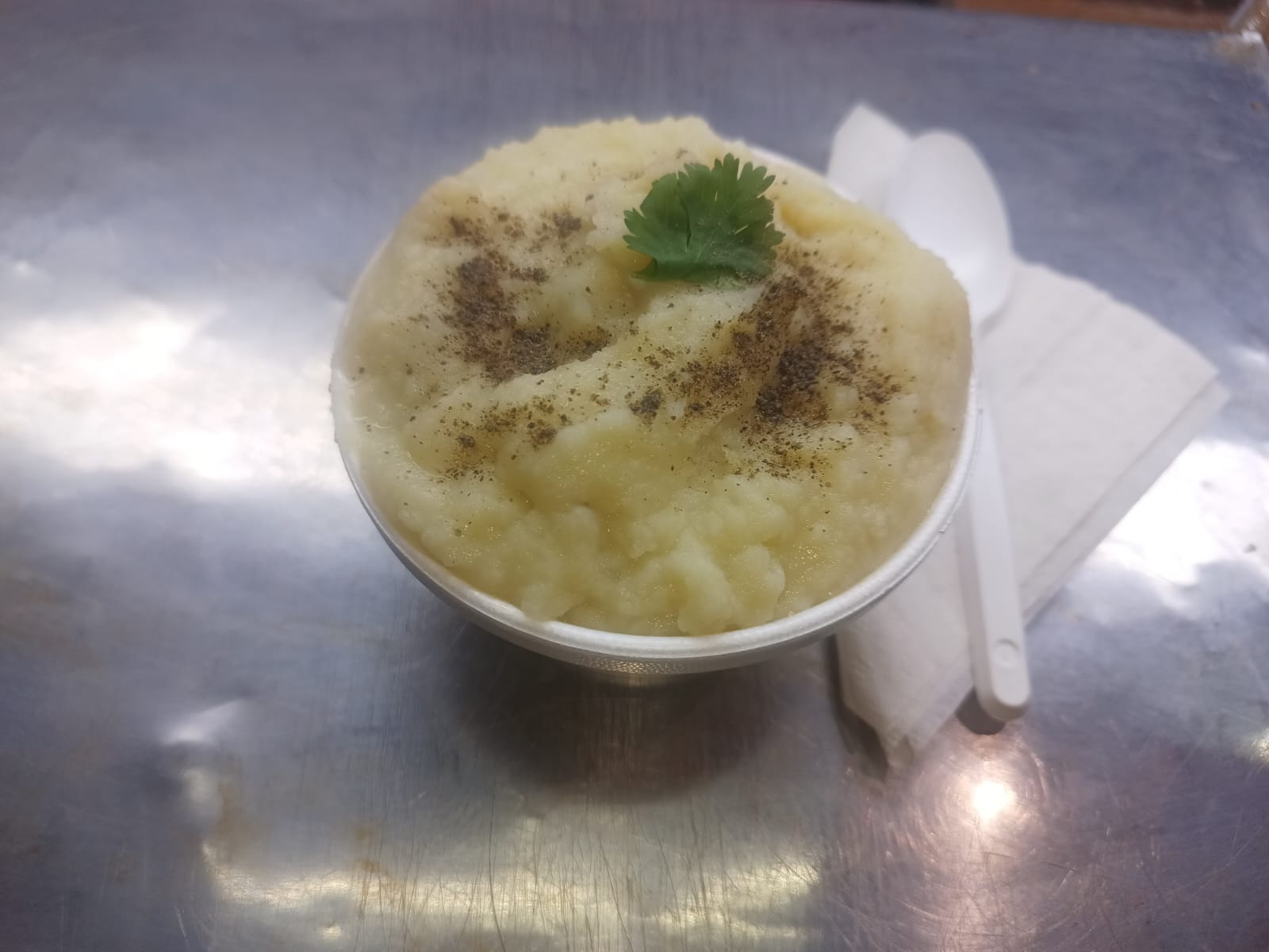 Papitas doradas con huevito acompañadas de frijoles refritos