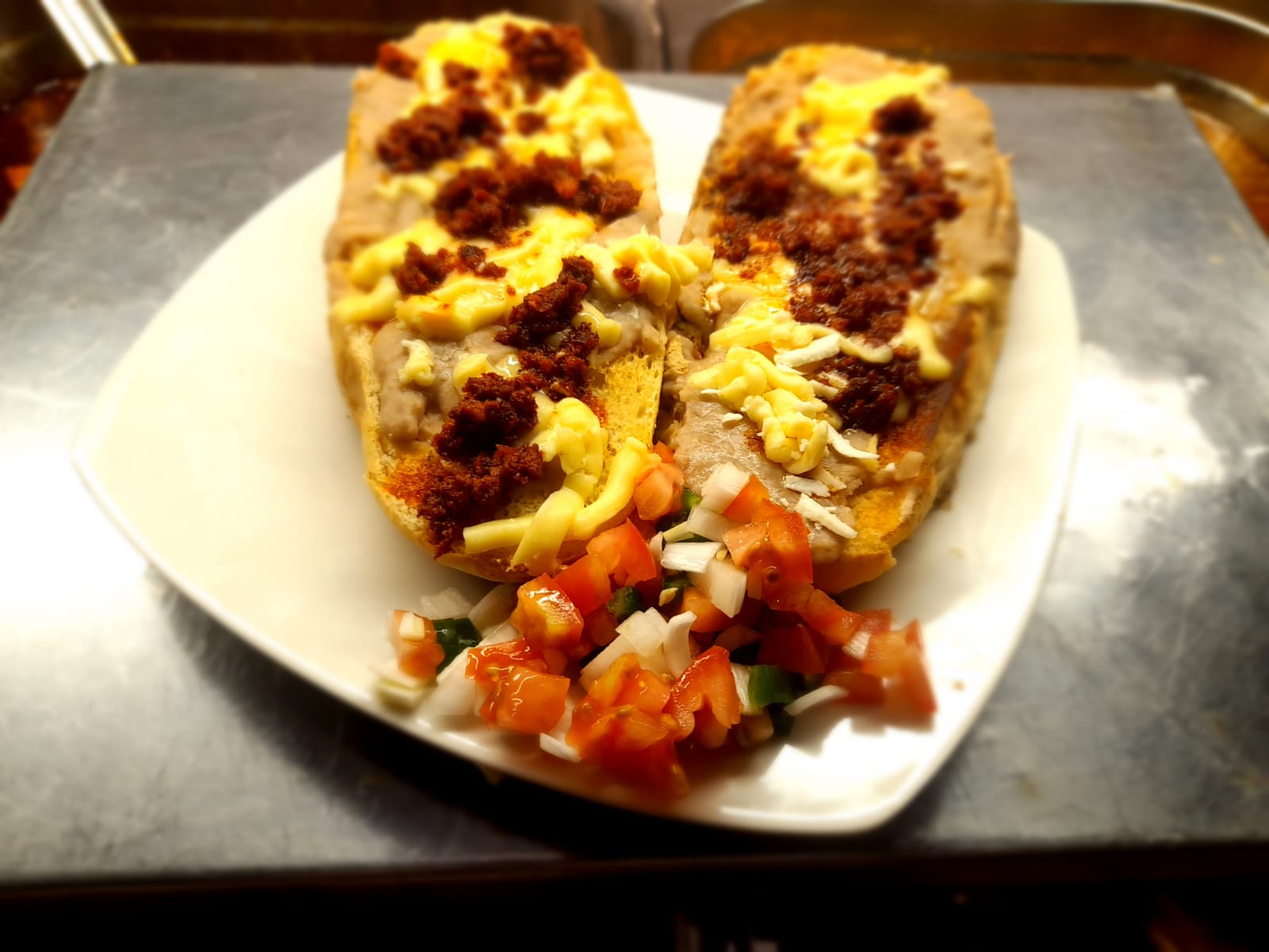 Pan lagunero, carne a elegir, queso, jamón, aguacate, lechuga, tomate, cebolla, aderezos y crema acompañados con chile jalapeño.