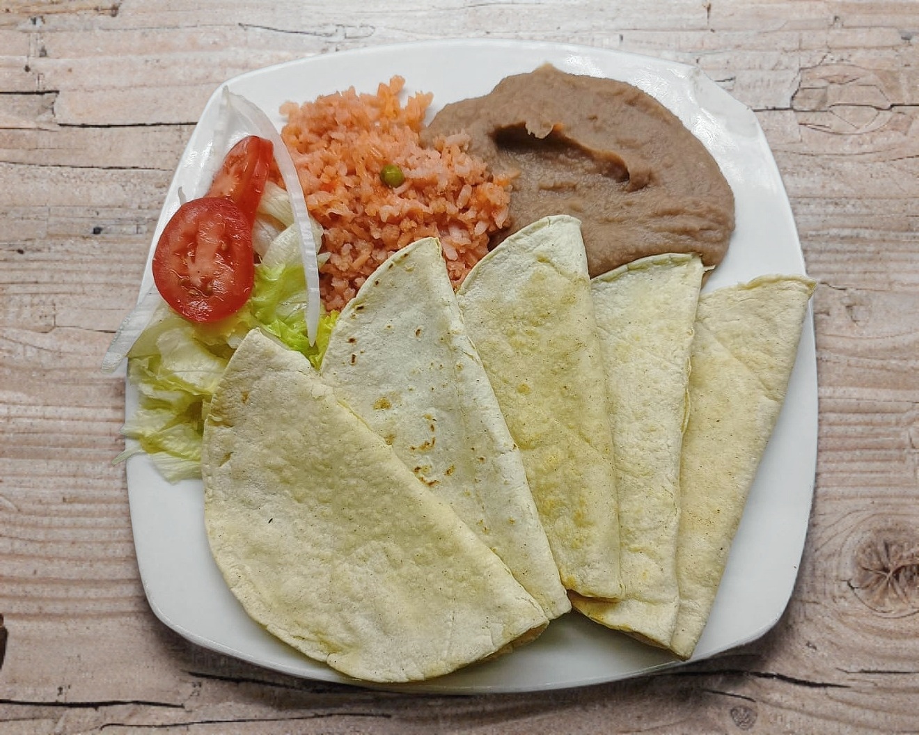 3 Piezas. Acompañadas de arroz, frijol y salsita casera.