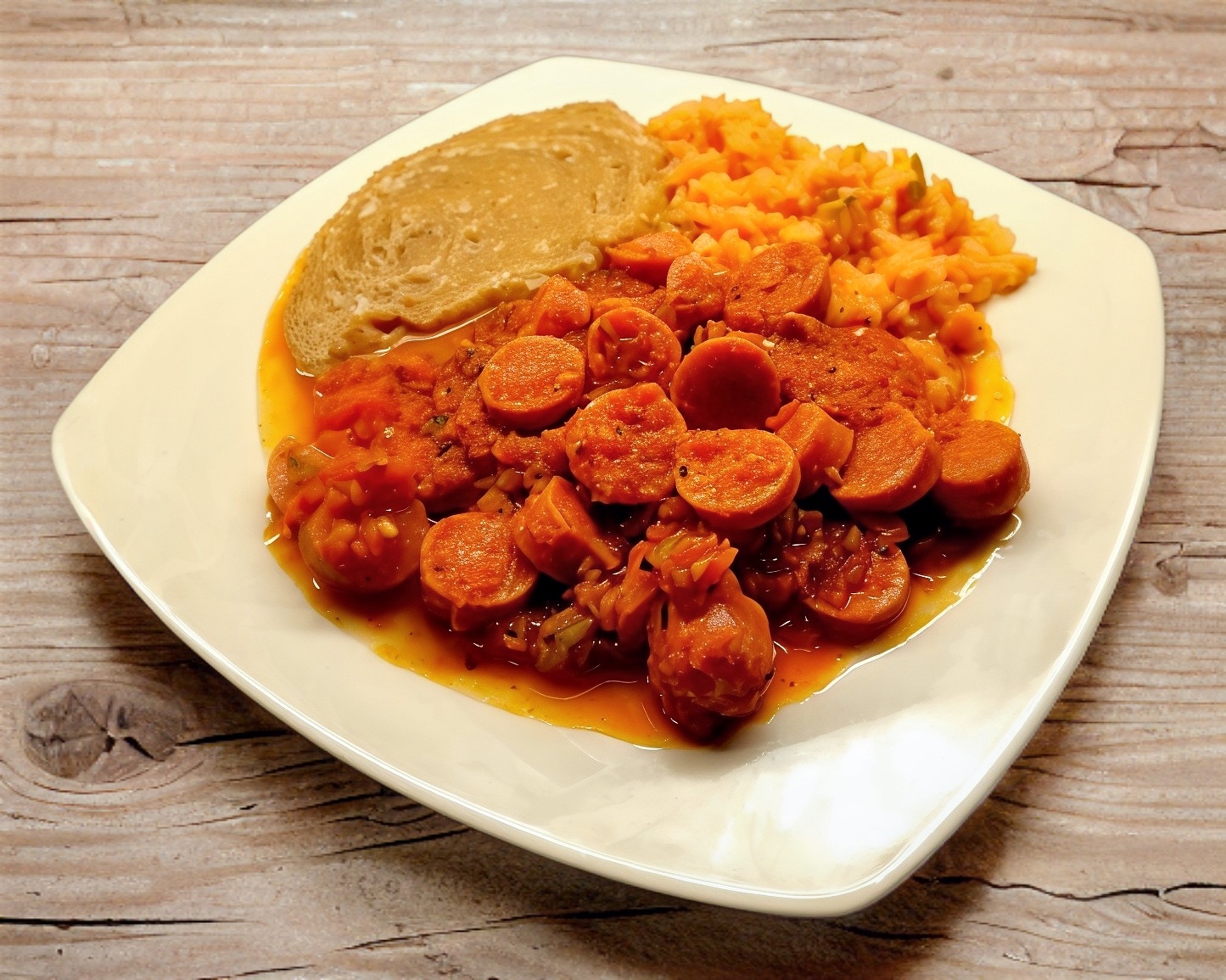 Huevos, salchicha de pavo, acompañados de arroz, frijol, tortillas y salsita casera.