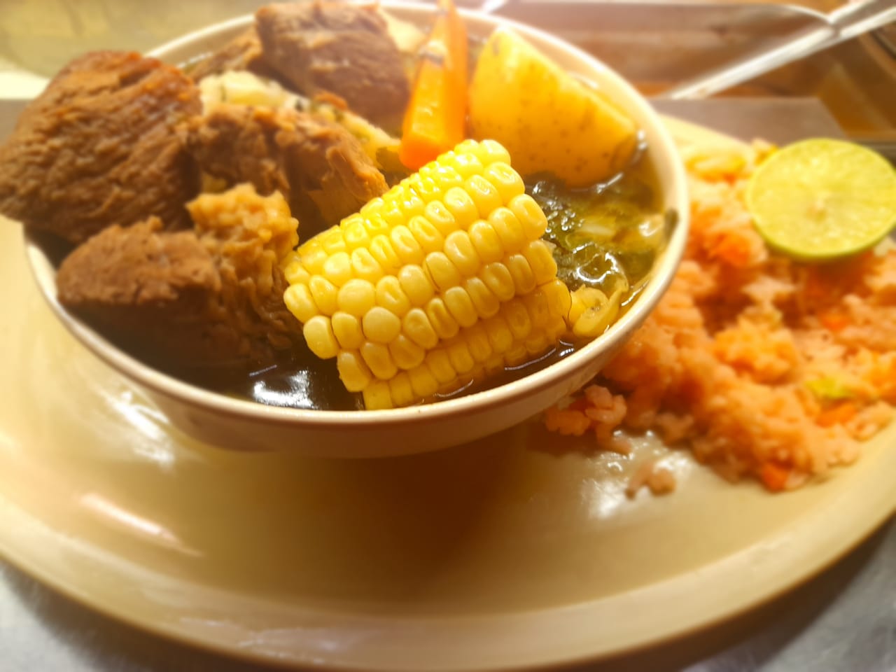 Típico platillo con carne de res (pecho), elote, calabaza, zanahoria, repollo y acompañado de arroz, tortillas, salsa, limón.