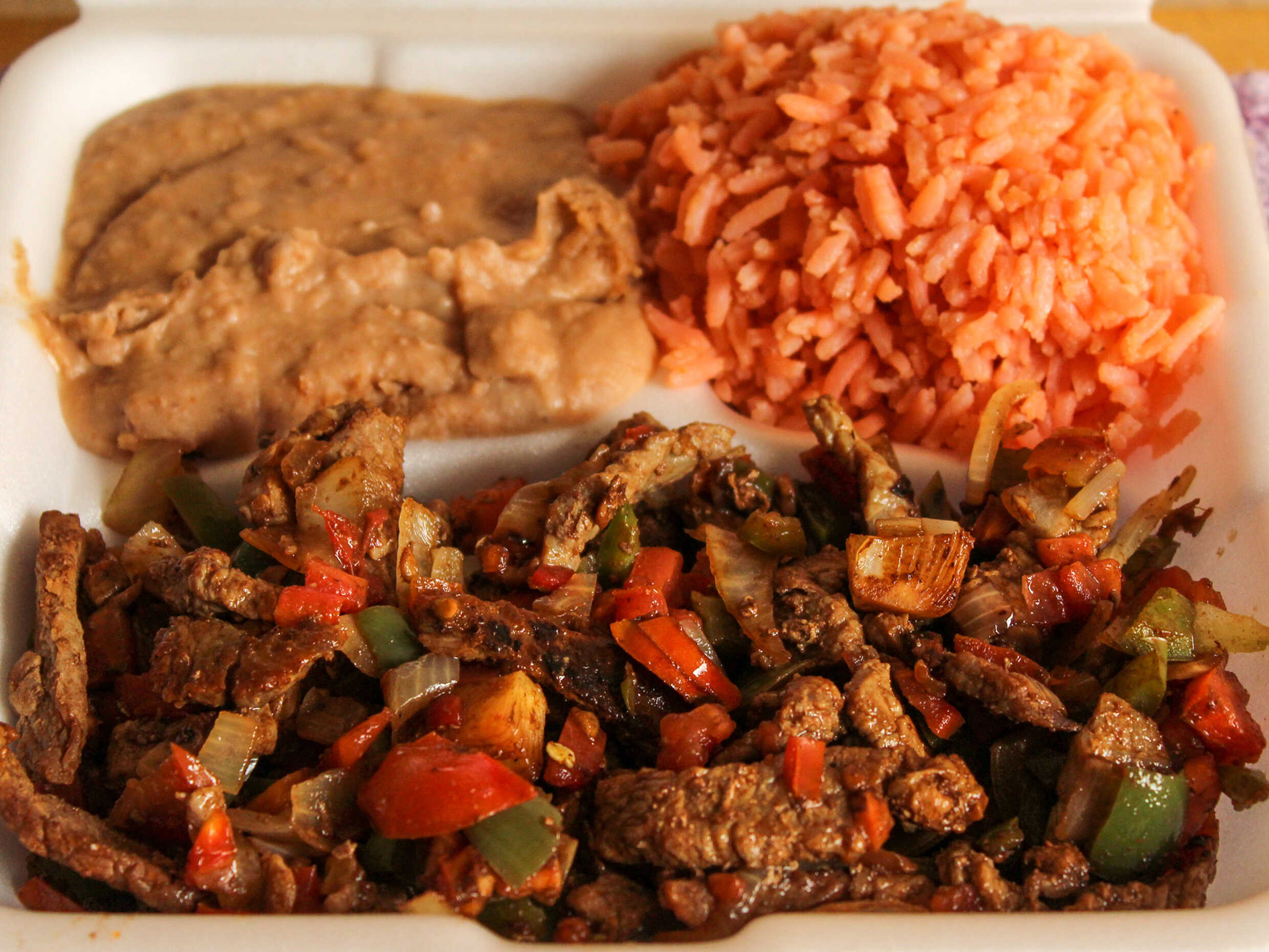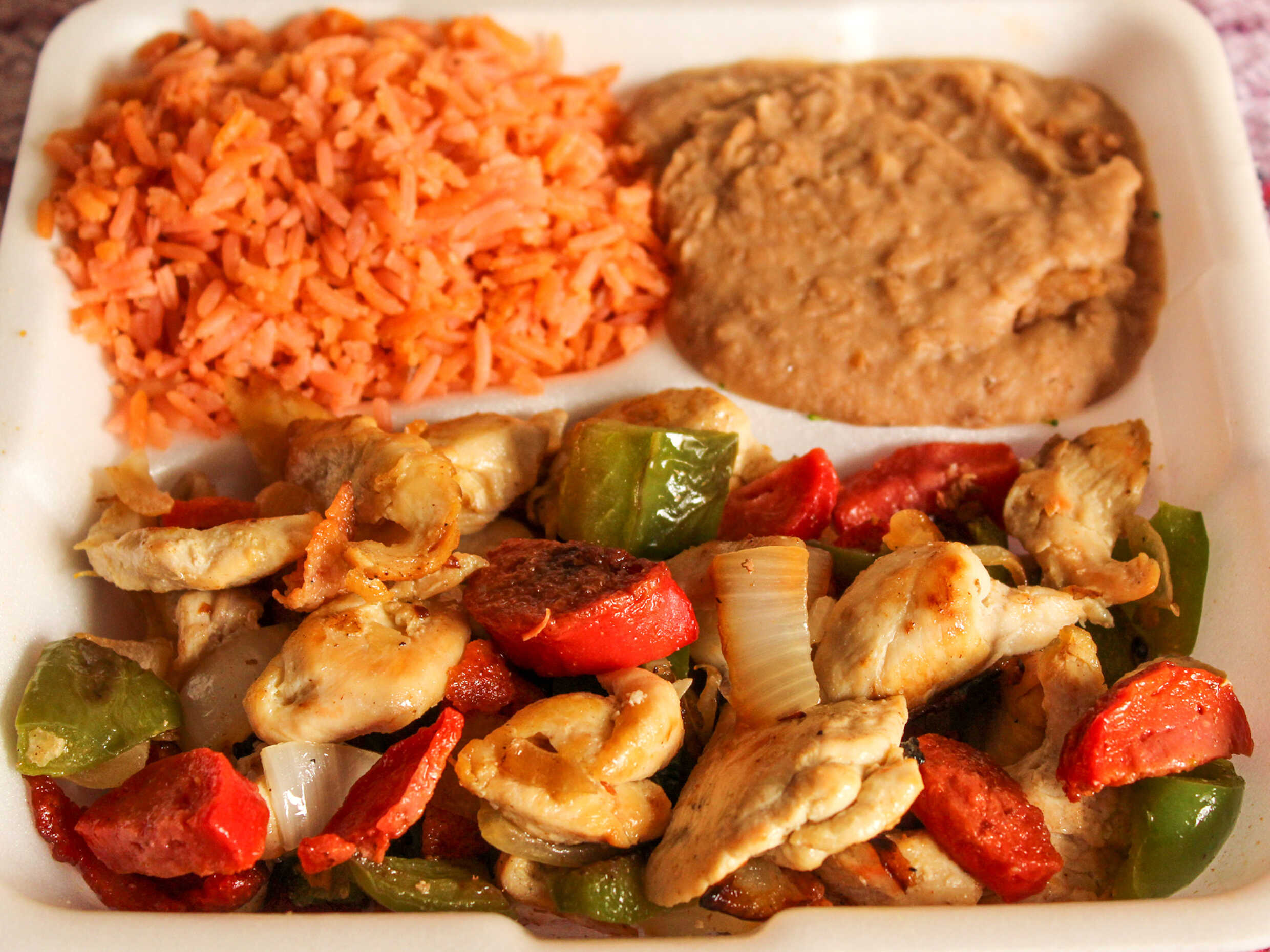 Suaves fajitas de res, pollo o mixta con morrón y cebolla acompañado de dos guarniciones a escoger de 1/2 lto c/u tortillas salsas limones.