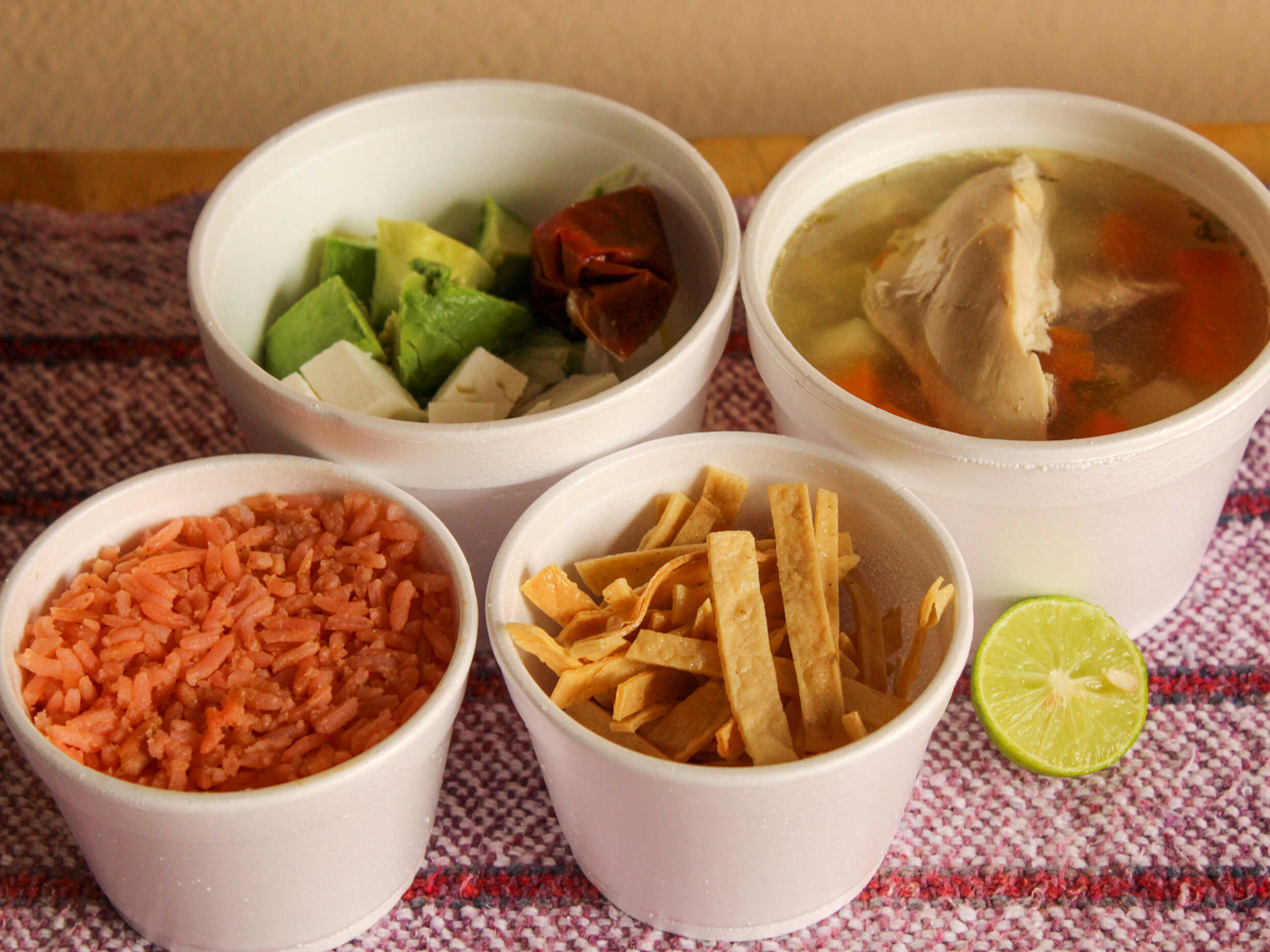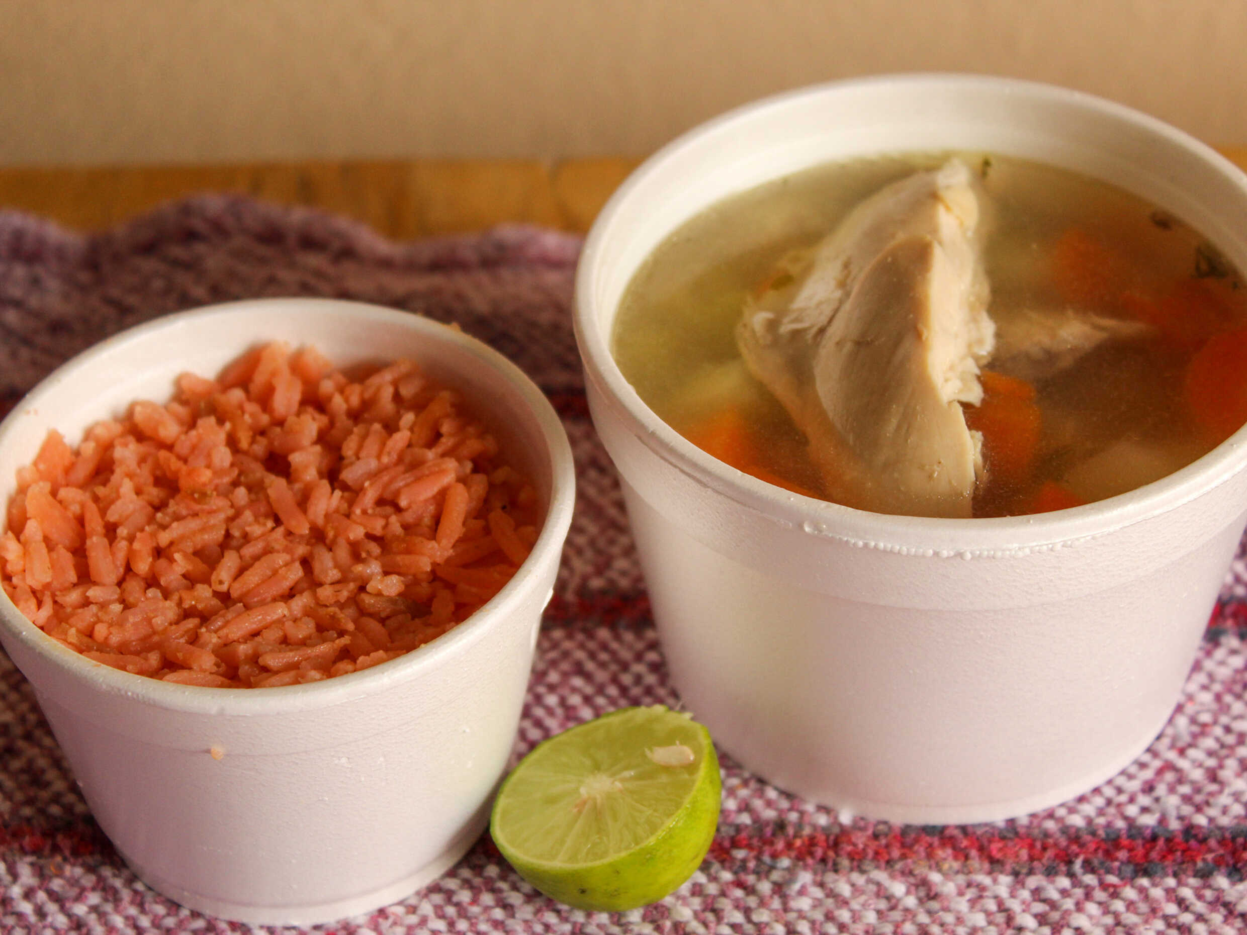 Caldo de Pechuga 1/2 Lto*1 + Arroz*1 + Tortillas, limón y salsa.*1