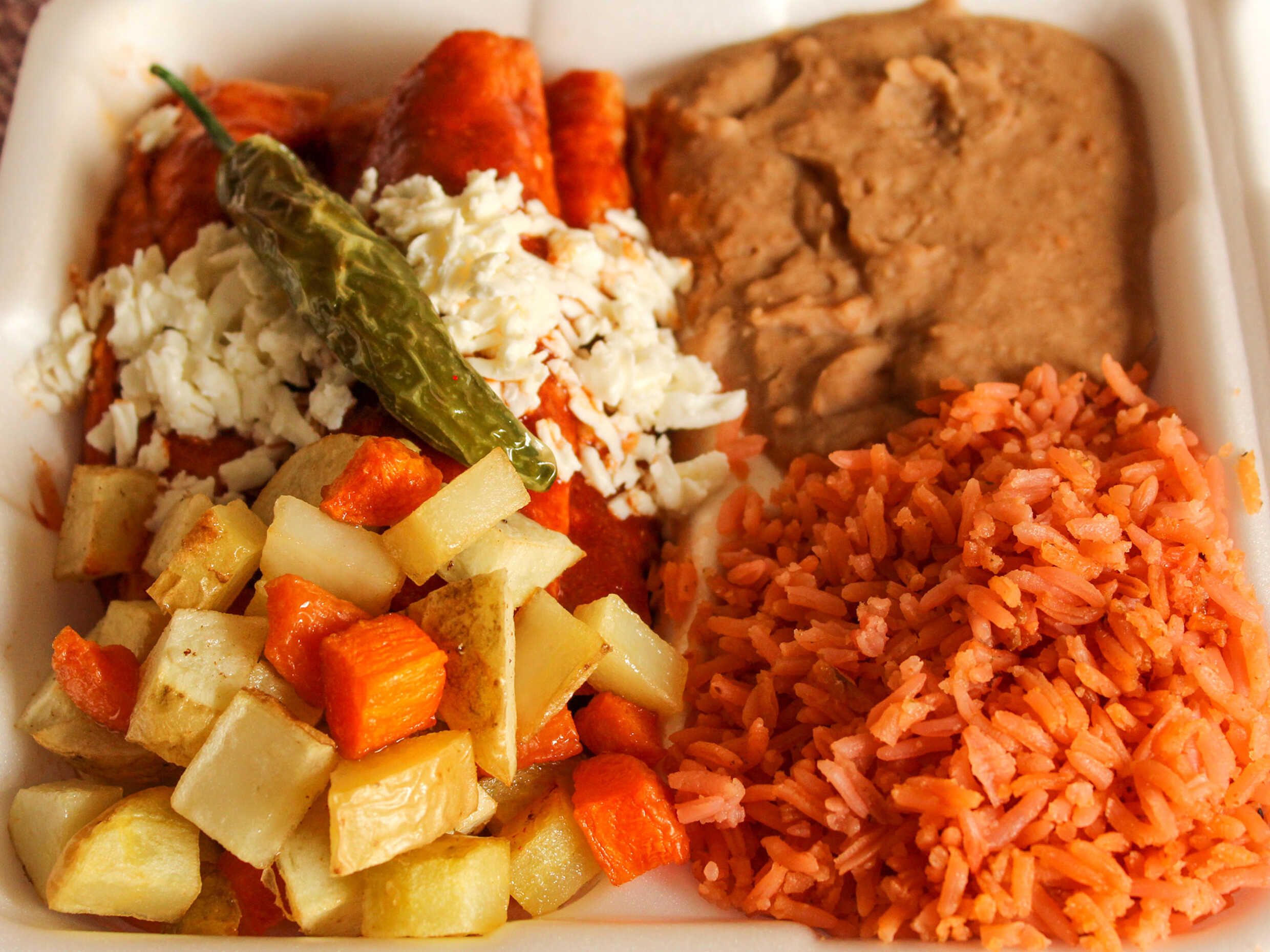 4 taquitos con papitas zanahoria y chile toreado. Tortilla pasada por chile colorado acompáñalas con tus guarniciones favoritas [2] y salsita picosa.