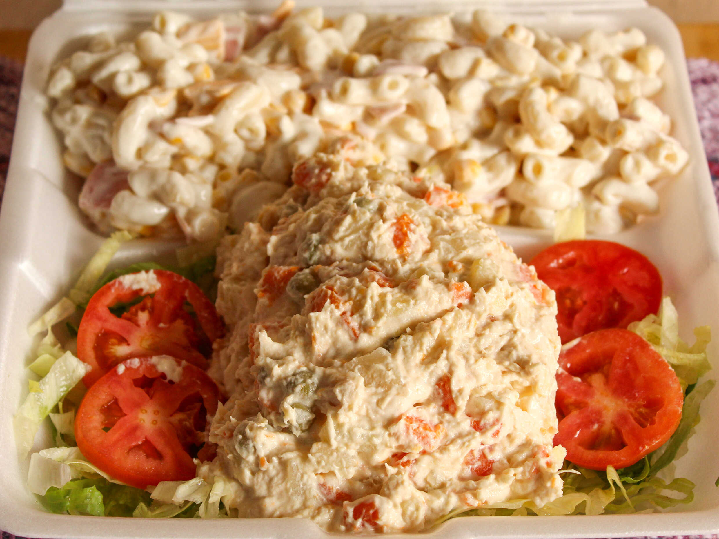 Rica ensalada de pollo acompañada de ensalada de lechuga con tomate y ensalada de coditos.