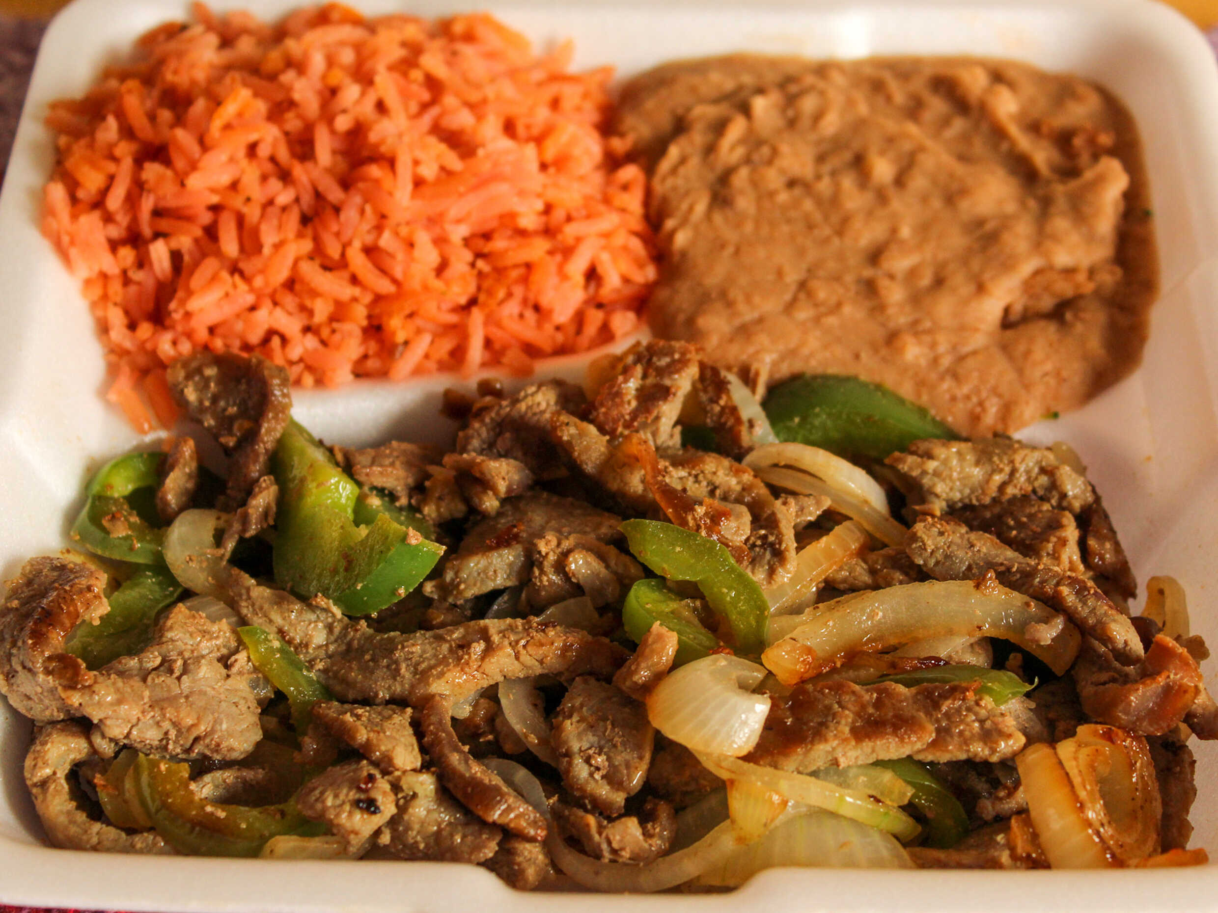 Con cebolla y morrón. 2 guarniciones a escoger. Tortillas salsa y limón.