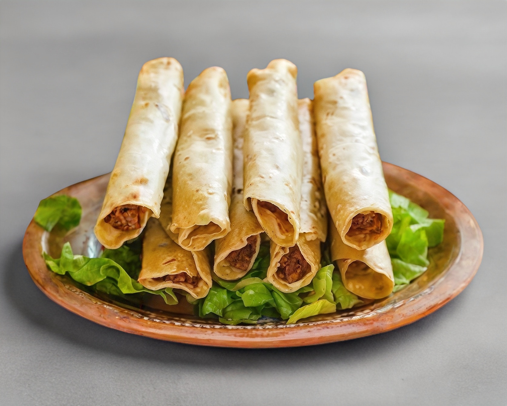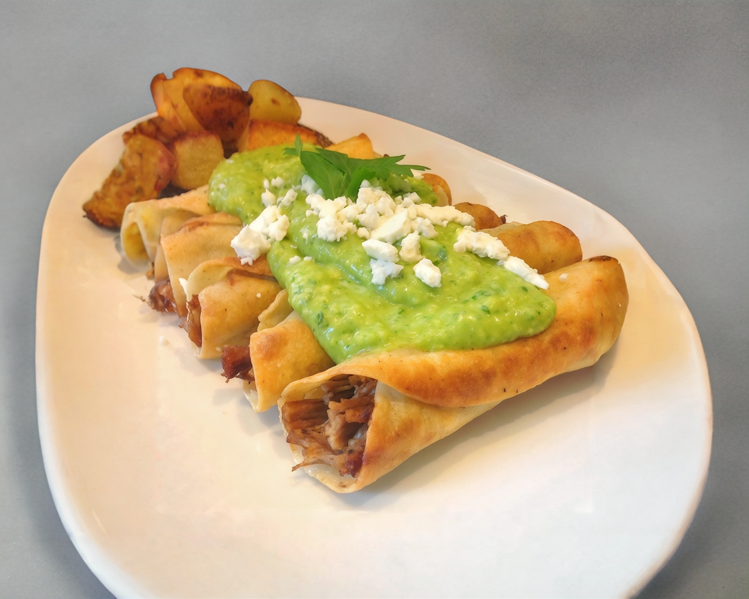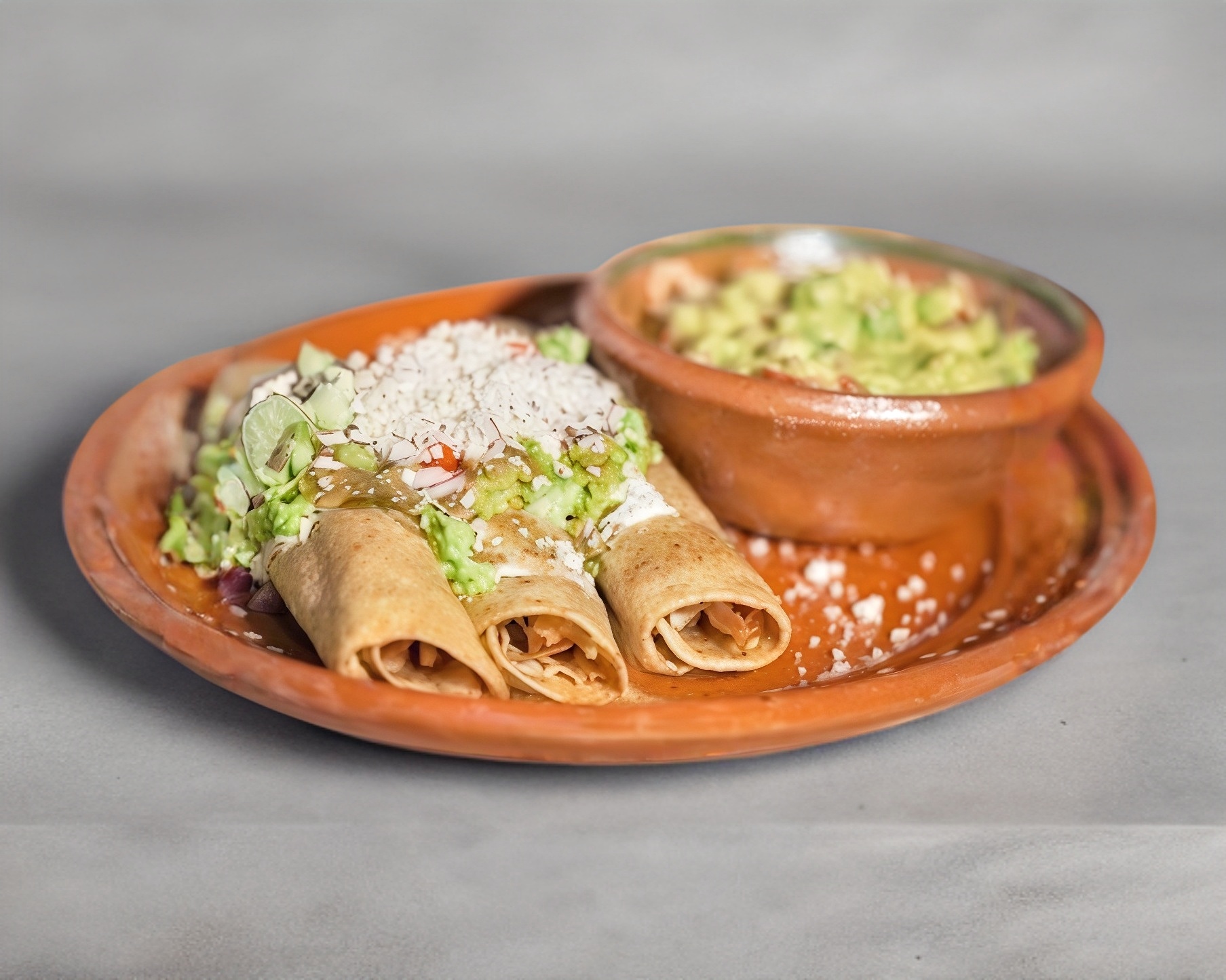5 Flautas de pechuga de pollo, acompañadas de arroz, lechuga, papa y zanahoria, crema y guacamole.