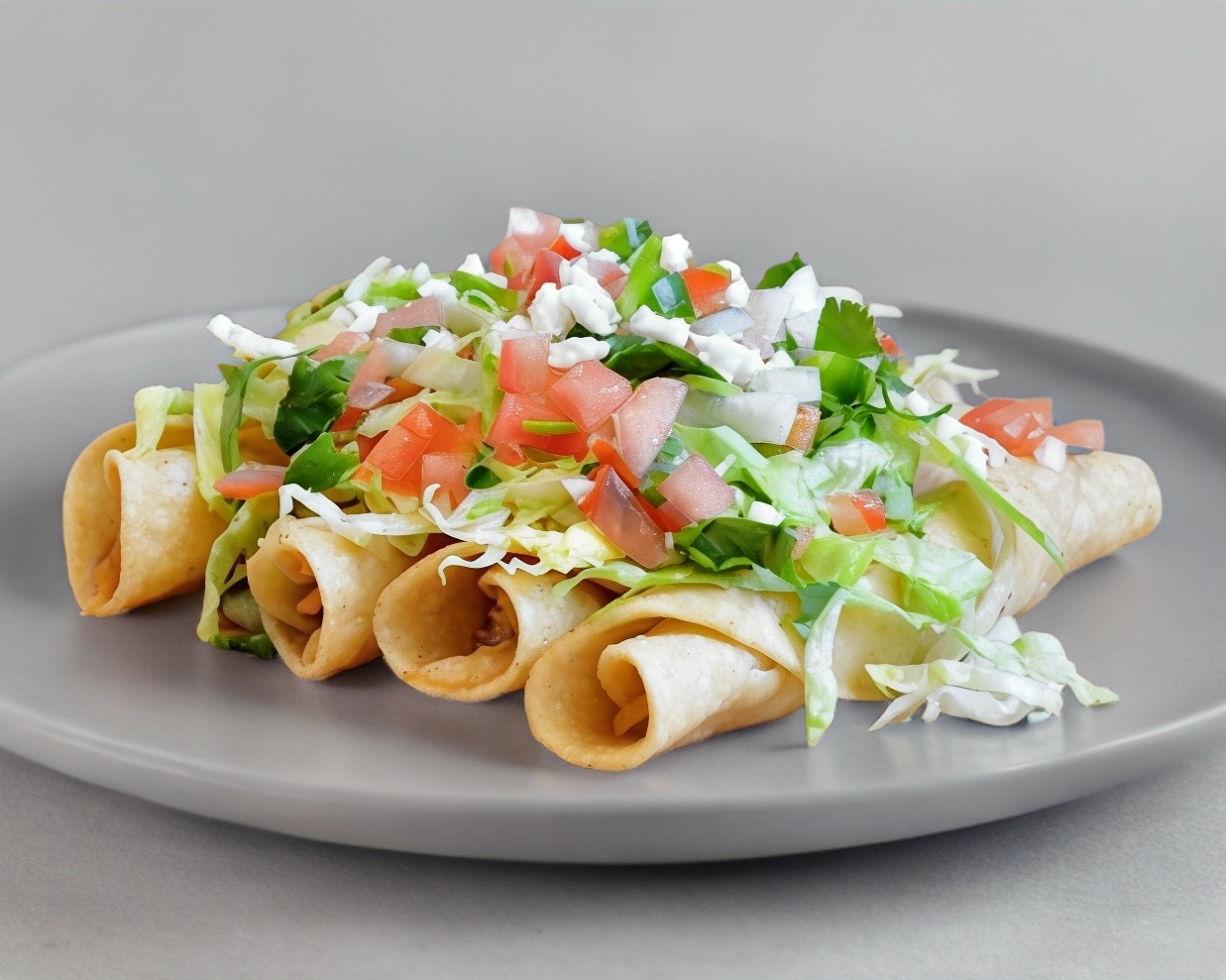5 Tacos dorados de pechuga de pollo, acompañados de lechuga, tomate, papa y zanahoria, arroz, crema, guacamole.