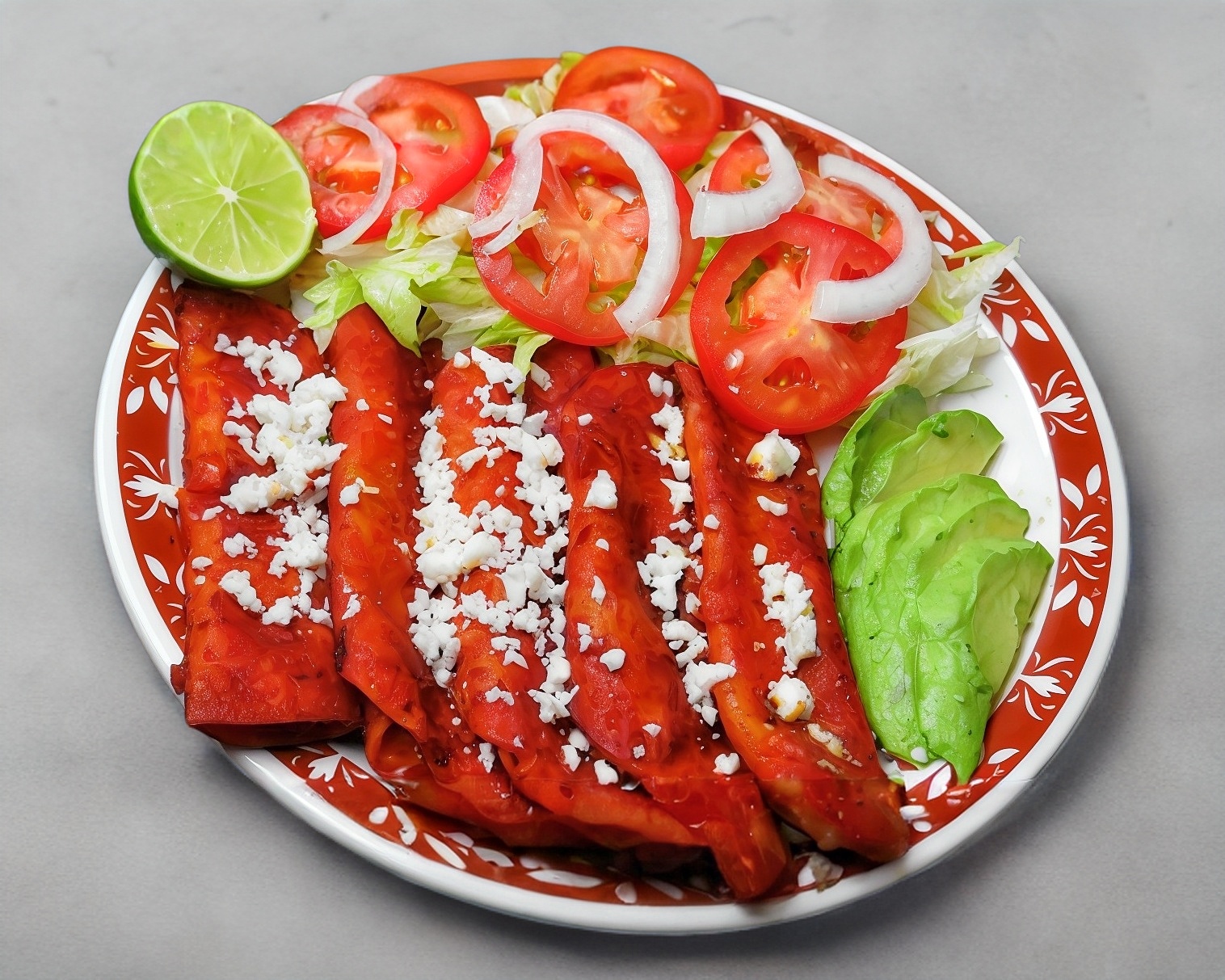 5 Piezas de enchiladas rojas, acompañadas de arroz, lechuga, papa y zanahoria.