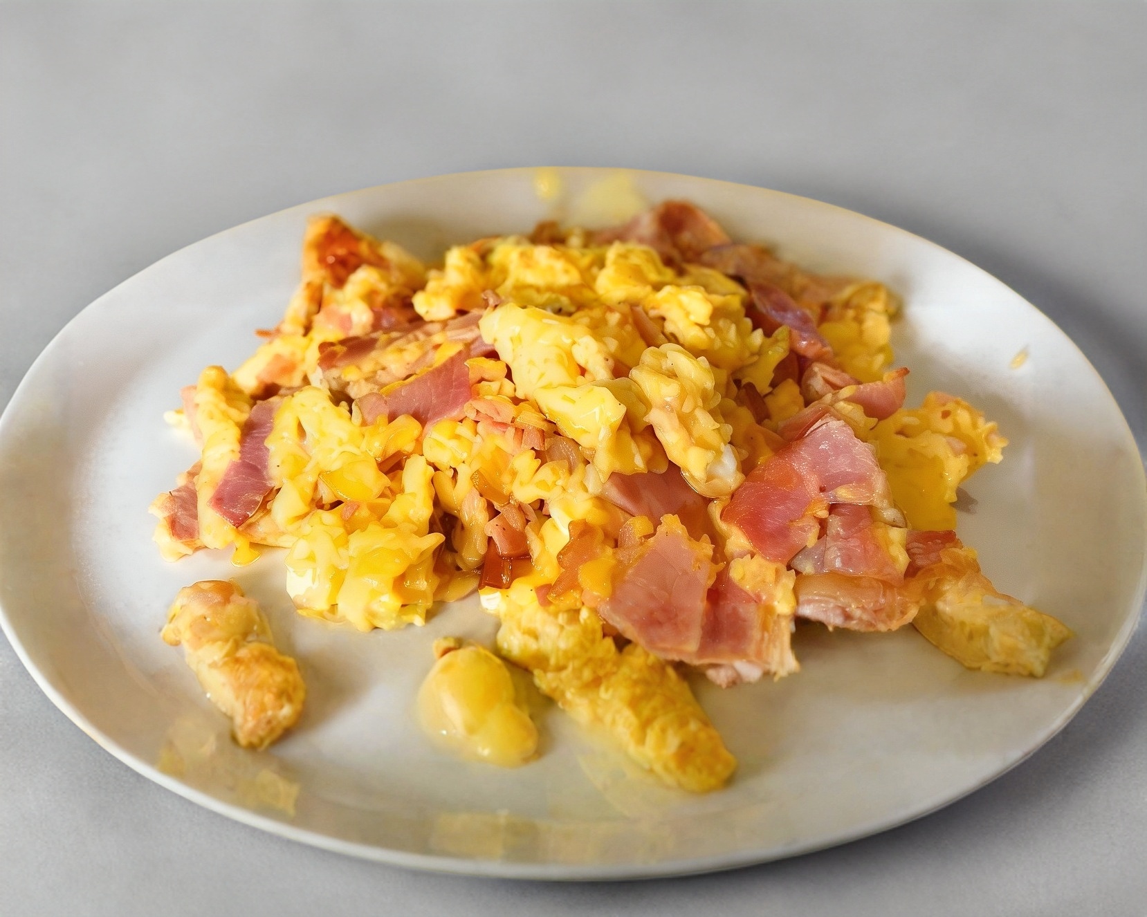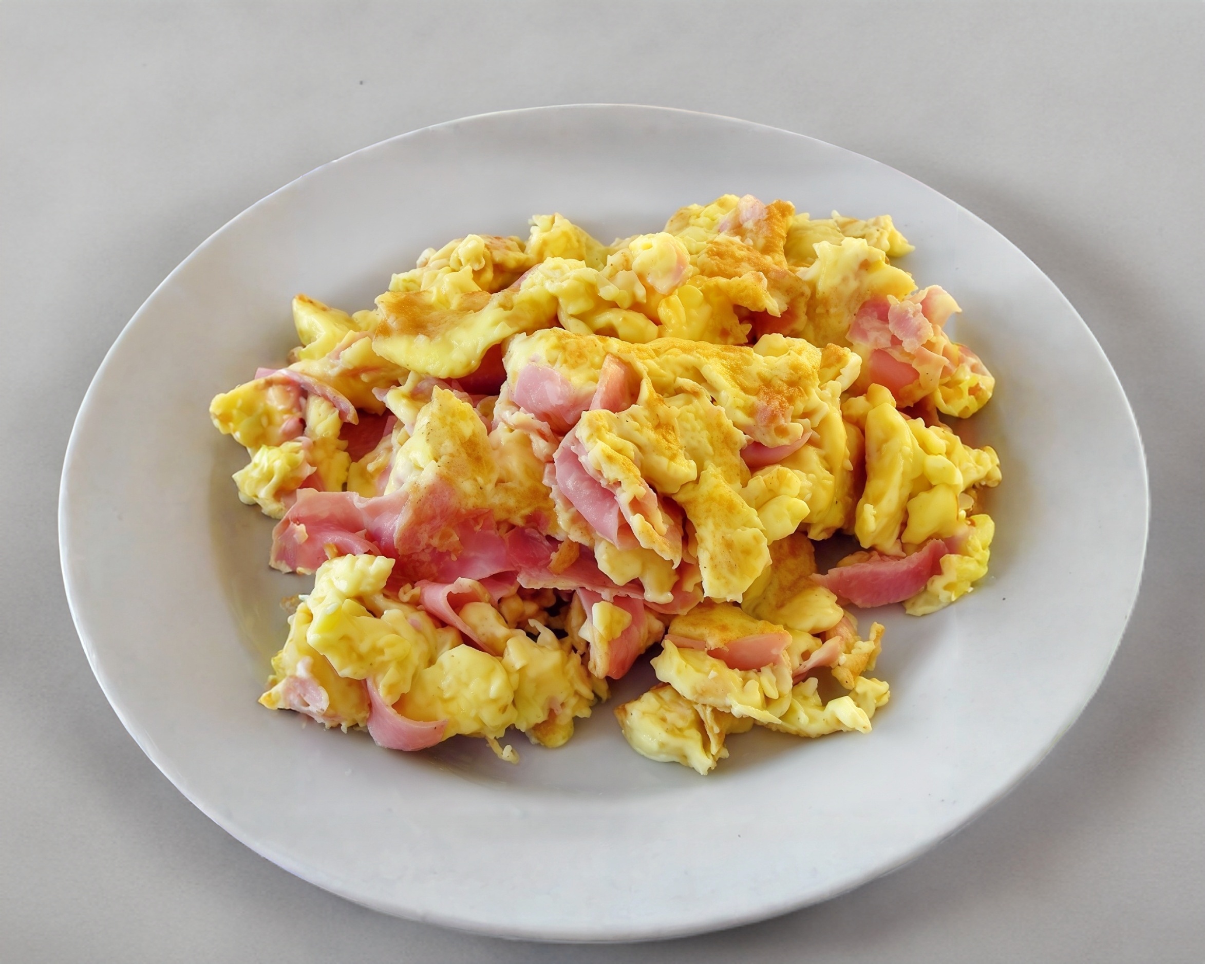 3 Piezas de huevos servidos con jamón y acompañados de 2 quesadillas en harina y frijoles refritos , con sus 5 piezas de tortillas.