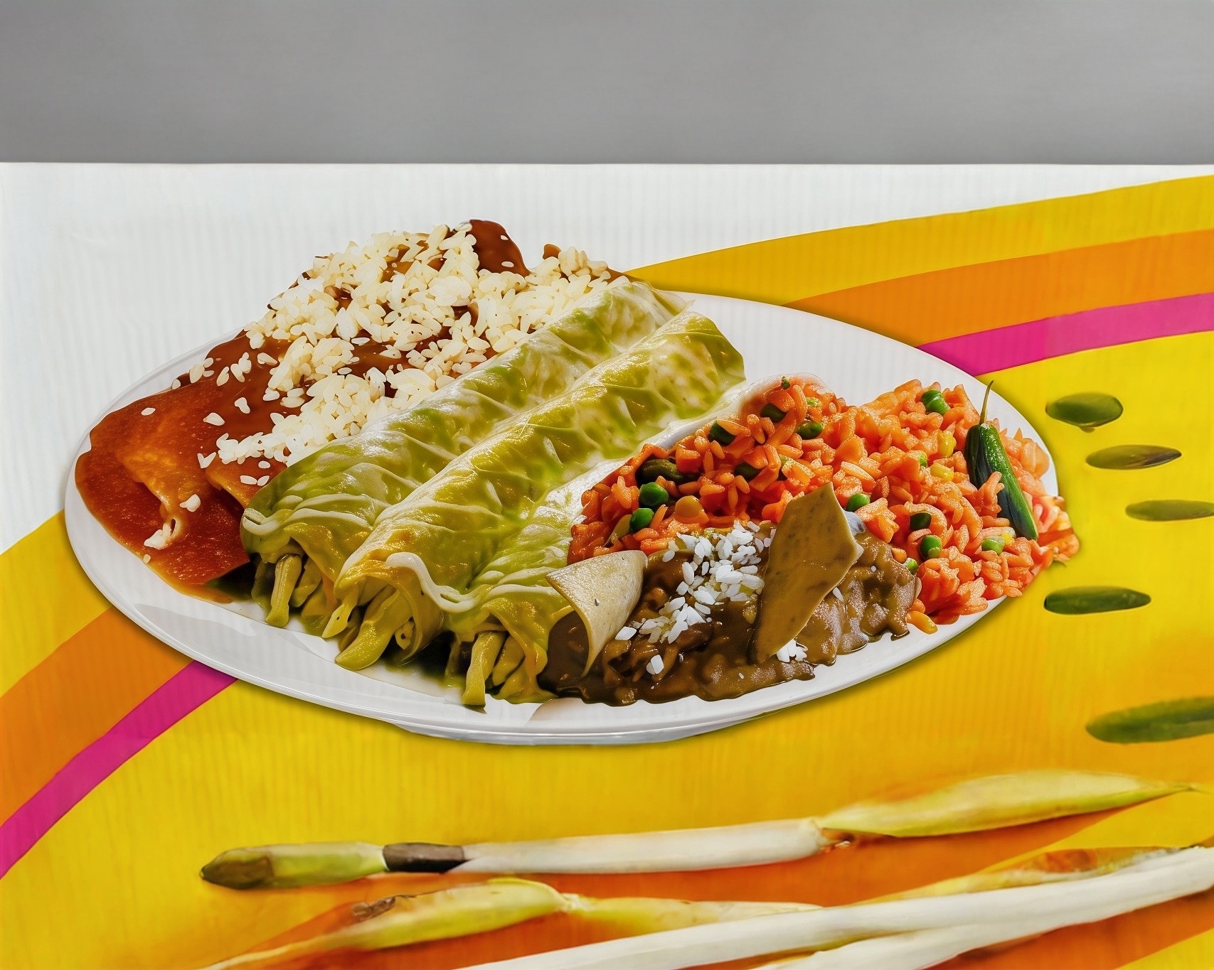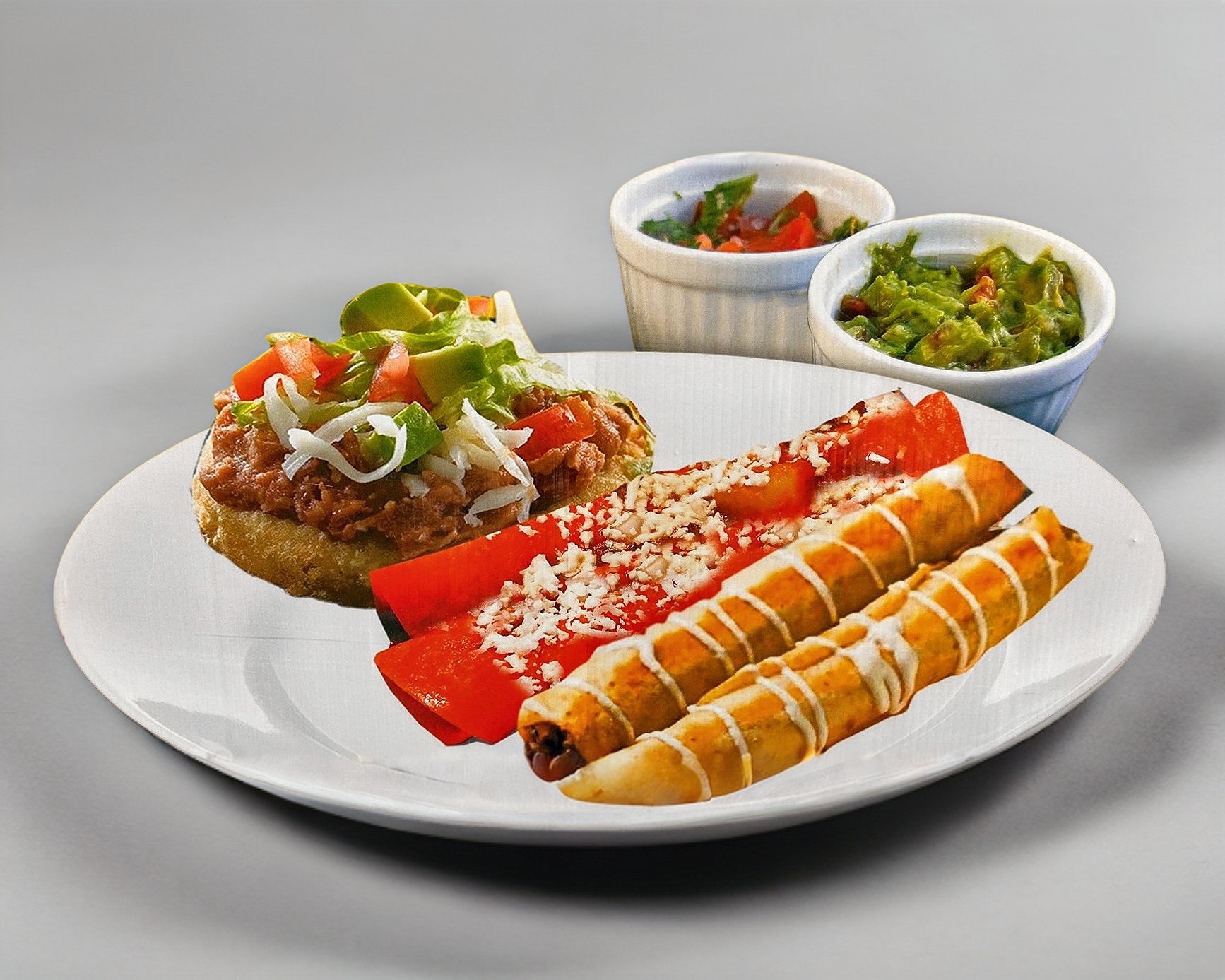 2 Enchiladas Rojas, 2 Flautas de Res, 1 Sope Chicharrón, incluye Arroz y Lechuga