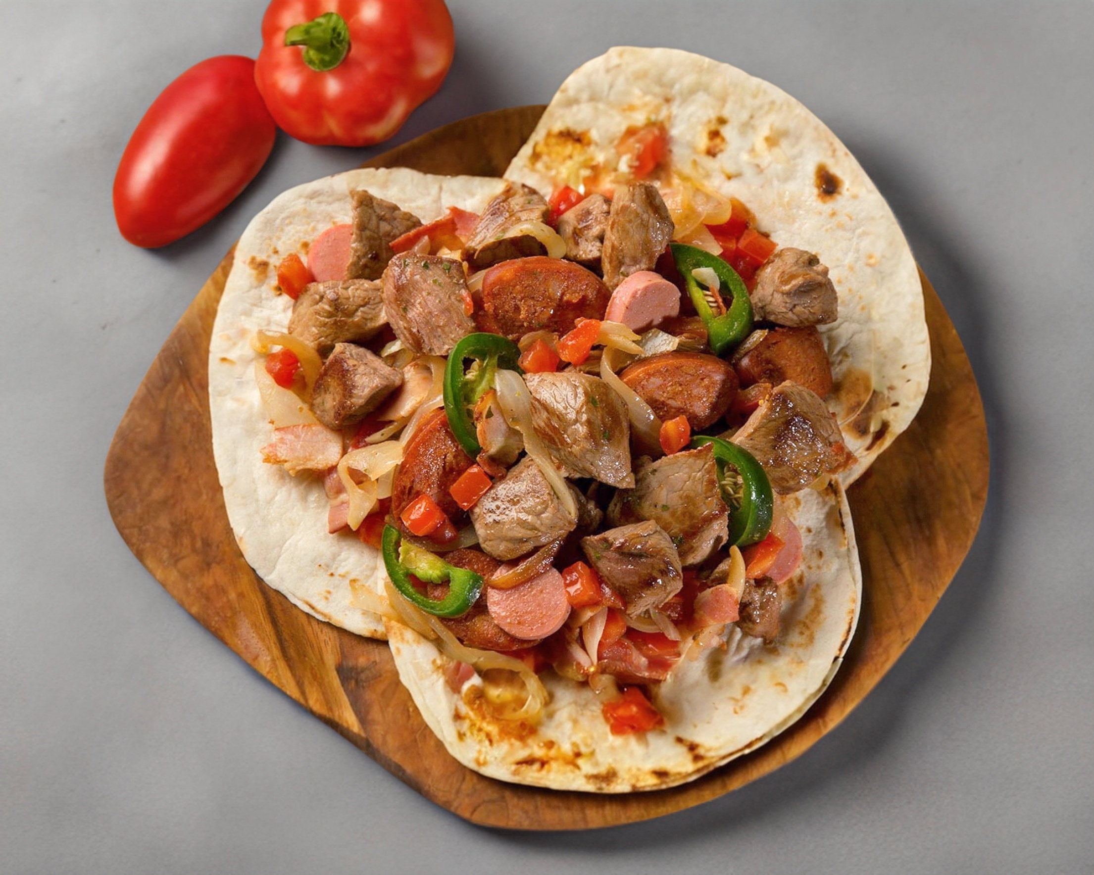 Deliciosa discada de carne de res y puerco, con tocino, morrón, salchicha para asar y cebolla, acompañado de 2 guarniciones y 5 tortillas.