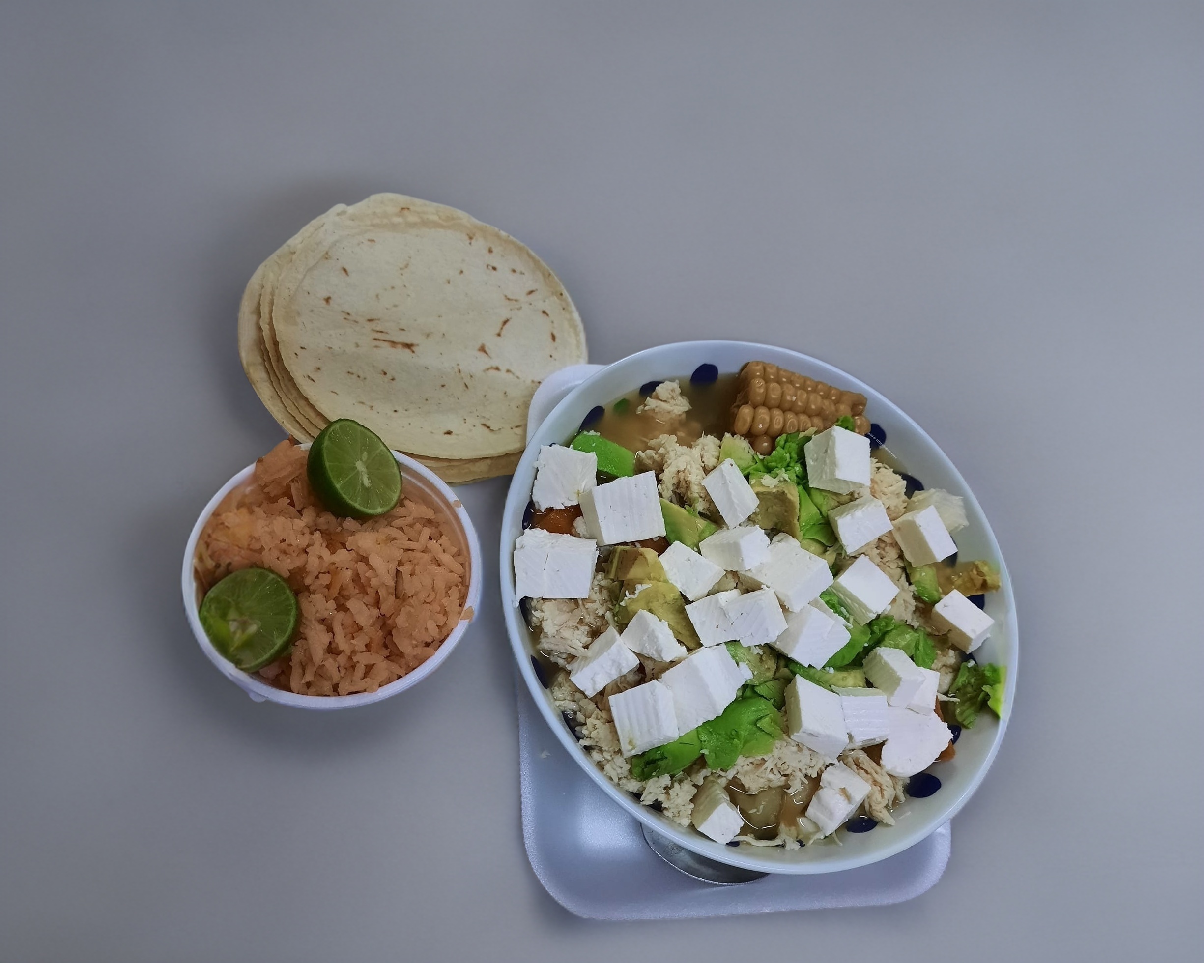 Rico caldo tlalpeño, con pollo, aguacate, queso panela, arroz y un toque de chile chipotle.