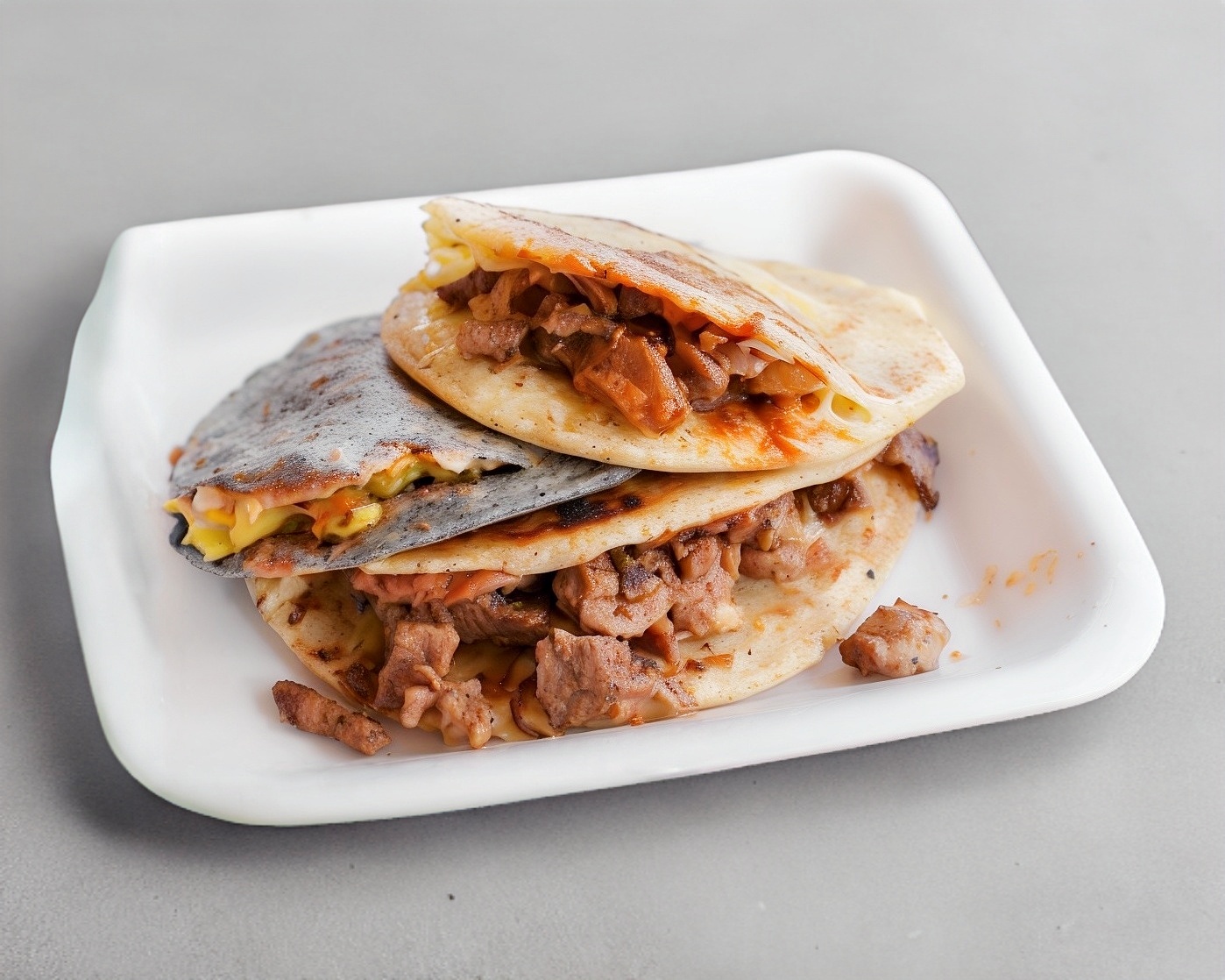3 Piezas de huevos con tocino, servidos con 2 quesadillas en harina , frijoles refritos y 5 piezas de tortillas en maíz.